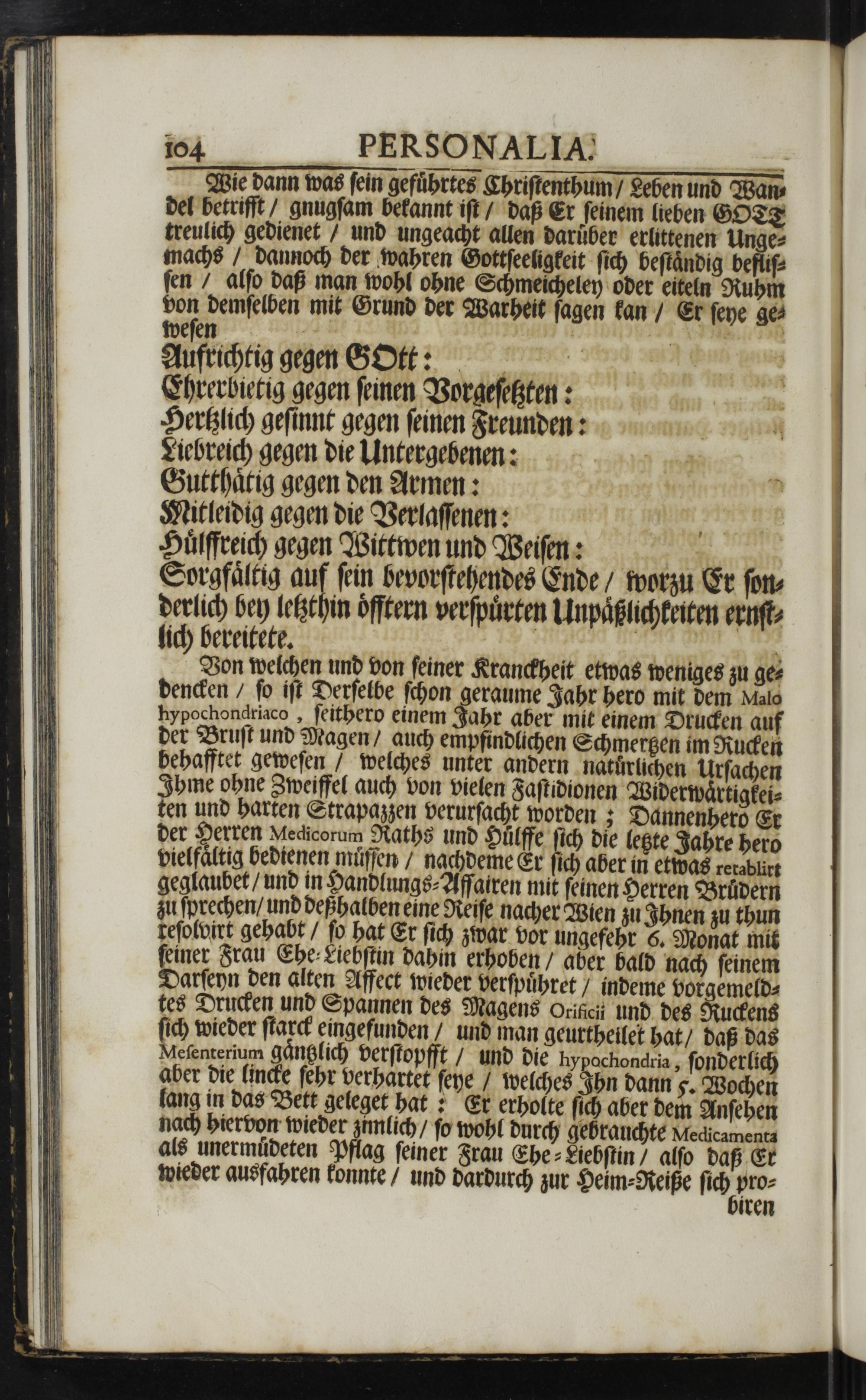 Von welchen und von ſeiner Kranckheit etwas weniges zu ge⸗ dencken/ ſo iſt Derſelbe ſchon geraume Jahr hero mit dem NMalo hypochondriaco, ſeithero einem Jahr aber mit einem Drucken auf der Bruſt und Magen/ auch empfindlichen Schmertzen im Rucken behafftet geweſen/ welches unter andern natuͤrlichen Urſachen Ihme ohne Zweiffel auch von vielen Faſtidionen Widerwaͤrtigkei⸗ ten und harten Strapazzen verurſacht worden; Dannenbero Er der Herren Mecicorum Raths und Hülffe ſich die letzte Jahre hero vielfaͤltig bedienen müſſen/ nachdeme Er ſich aber in etwas rerabürt geglaubet/ und in Handlungs⸗Afſairen mit ſeinen Herren Bruͤdern zu ſprechen/ und deßhalben eine Reiſe nacher Wien zu Ihnen zu thun reſolvirt gehabt/ ſo hat Er ſich zwar vor ungefehr 6. Monat mit ſeiner Frau Ehe⸗Liebſtin dahin erhoben/ aber bald nach ſeinem Darſeyn den alten Affect wieder verſpuͤhret/ indeme vorgemeld⸗ tes Drucken und Spannen des Magens Orinci und des Ruckens ſich wieder ſtarck eingefunden/ und man geurtheilet hat/ daß das Meſenterium gaͤntzlich verſtopfft/ und die hypachondria, ſonderlich aber die lincke ſehr verhartet ſeye/ welches Ihn dann 5. Wochen lang in das Bett geleget hat: Er erholte ſich aber dem Anſehen nach hiervon wieder zimlich/ ſo wohl durch gebrauchte Medicamenta als unermuͤdeten Pflag ſeiner Frau Ehe⸗Liebſtin/ alſo daß Er wieder ausfahren konnte/ und dardurch zur Heim⸗Reiße ſich pro⸗
