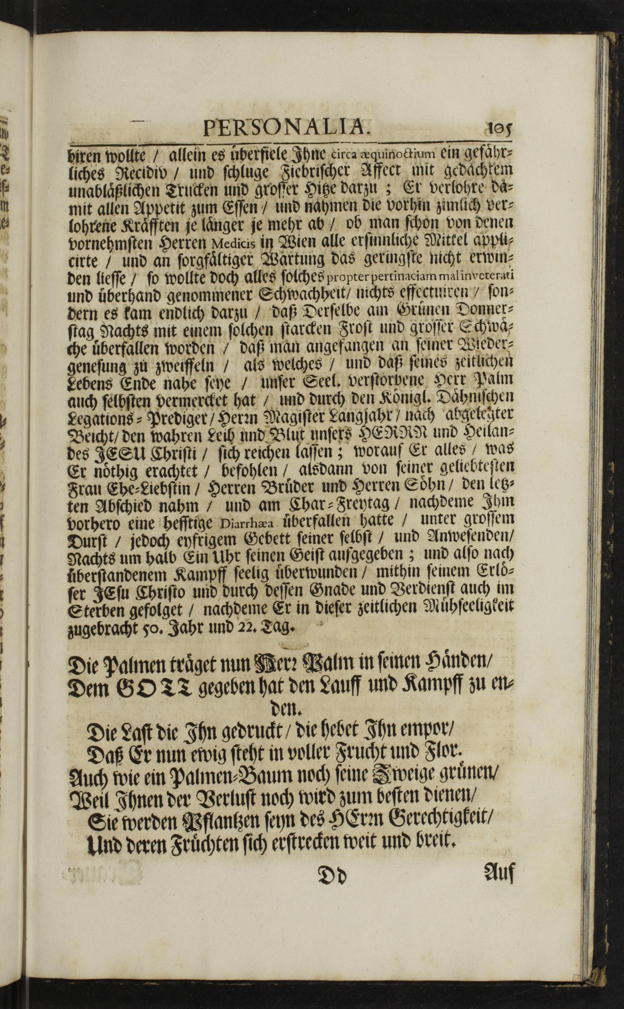 viren wollte/ allein es uͤberfiele Ihne circa æquinoctium ein gefahr⸗ liches Recidiv/ und ſchluge ſewwichen Affect mit gedachtem unablaͤßlichen Trucken und groſſer Hitze darzu; Er verlohre daͤ⸗ mit allen Appetit zum Eſſen/ und nahmen die vorhin zimlich ver⸗ lohrene Kraͤfften je laͤnger je mehr ab/ ob man ſchon von denen vornehmſten Herren Medicis Tbien alle erſinnliche Mittel appli⸗ cirte/ und an ſorgfaͤltiger Wartung das geringſte nicht erwin⸗ den lieſſe /ſo wollte doch alles ſolches propter pertinaciam malinveterati und uͤberhand genommener Schwachheit/ nichts effectuiren/ ſon⸗ dern es kam endlich darzu/ daß Derſelbe am Grünen Donner⸗ ſtag Nachts mit einem ſolchen ſtarcken Froſt und groſſer Schwaͤ⸗ che uͤberfallen worden/ daß man angefangen an ſeiner Wieder⸗ geneſung zu zweiffeln/ als welches/ und daß ſeines zeitlichen Lebens Ende nahe ſeye/ unſer Seel. verſtorbene Herr Palm auch ſelbſten vermercket hat/ und durch den Konigl. Daͤhniſchen Legations⸗Prediger/ Herꝛn Magiſter Langjahr/ nach abgetegter Beicht/ den wahren Leih und Blut unſers HERRN und Heilan⸗ des JESu Chriſti/ ſich reichen aſſen; worauf Er alles/ was Er noͤthig erachtet/ befohlen/ alsdann von ſeiner geliebteſten Frau Ehe⸗Liebſtin/ Herren Bruͤder und Herren Sohn/ den letz⸗ ten Abſchied nahm/ und am Char⸗Freytag/ nachdeme Ihm vorhero eine heſſtige Diarrhæa uͤberfallen hatte/ unter groſſem Durſt/ jedoch eyfrigem Gebett ſeiner ſelbſt/ und Anweſenden/ Nachts um halb Ein Uhr ſeinen Geiſt aufgegeben; und alſo nach üͤberſtandenem Kampff ſeelig uͤberwunden/ mithin ſeinem Erloͤ⸗ ſer IEſu Chriſto und durch deſſen Gnade und Verdienſt auch im Sterben gefolget/ nachdeme Er in dieſer zeitlichen Muͤhſeeligkeit zugebracht 50. Jahr und 22. Tag.