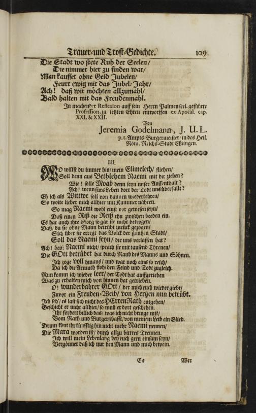 Soll das Naemi ſeyn/ die uns verlaſſen hat? Ach! heiſ Naemt nicht/ prach ſie mit tauſend Threnen/ Die GOtt betruͤbet hat durch Raub des Manns und Soͤhnen. 20 zoge voll hinaus/ und war noch eins ſo reich/ a ich die Armuth floh/ den Feind und Todt zugleich. Nun komm ich wieder leer/ der Todt hat auffgerieben Was zu erhalten mich von hinnen hat getrieben. 9! wunderbahrer GOtt/ der mich euch wieder giebt/ Zuvor ein Freuden⸗Weib/ von Hertzen nun betruͤbt. Ich ſeh/ es laſt ſich nicht des HErren Rath entgehen/ Geſchicht er nicht allhier/ ſo muß er dort geſchehen. Ihr fordert billich das/ was ich nicht bringe mit/ DBom Rath und Burgerſchafft/ von meinem Leib ein Glied. Drum koͤnt ihr küͤnfftig hin nicht mehr Naemi nennen/ Die Mara worden iſt/ durch allzu bittres Trennen. Ich will mein Lebenlang bey euch gern einſam ſeyn/ Vergoͤnnet daß ich nur den Mann und mich bewein.