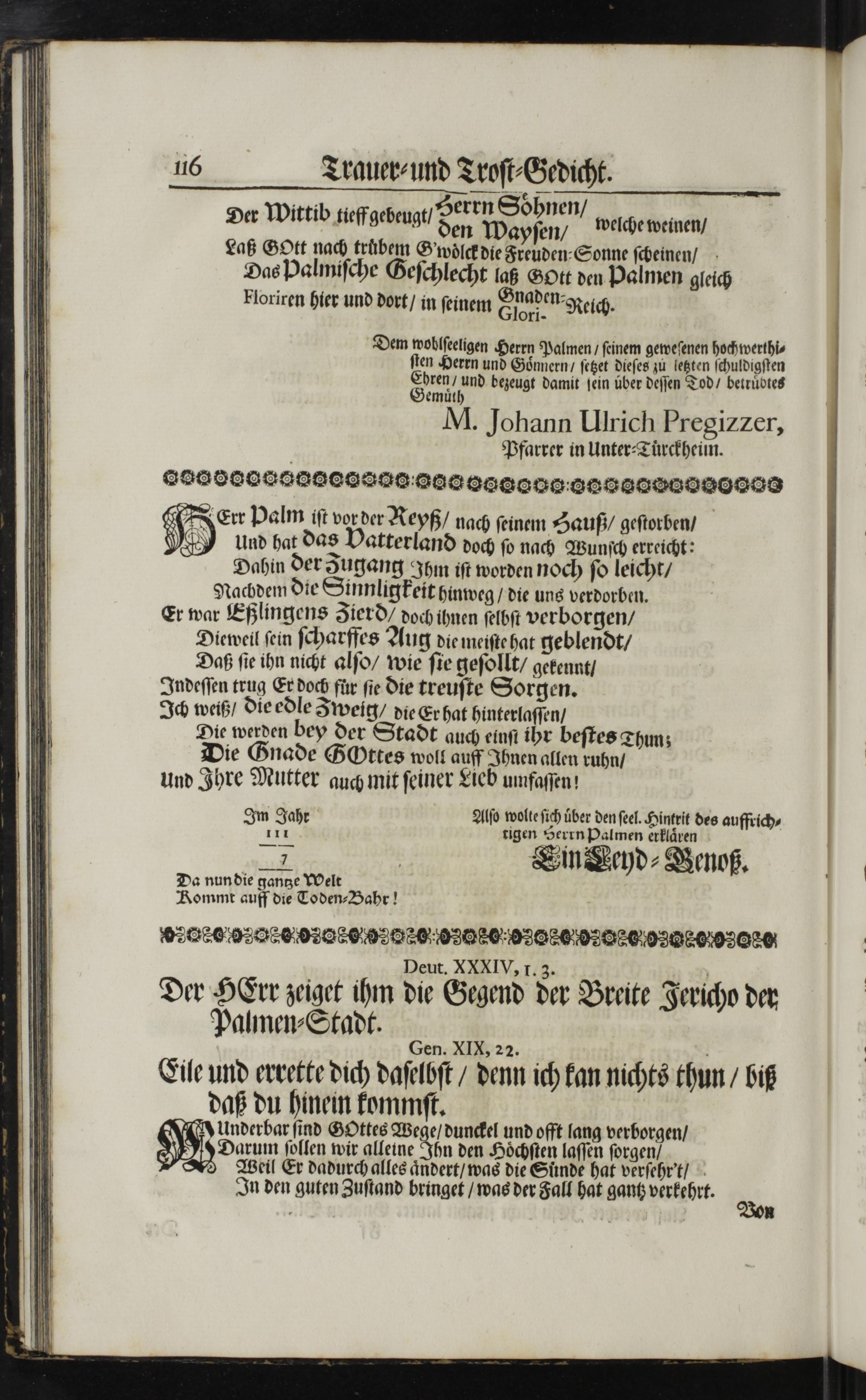Serr Palm iſt vor der Reyß/ nach ſeinem Hauß/ geſtorben/ und hat das Vatterland doch ſo nach Wunſch erreicht: Dahin der Zugang Ihm iſt worden noch ſo leicht/ Nachdem die Sinnligkeit hinweg/ die uns verdorben. Er war Eßlingens Zierd/ doch ihnen ſelbſt verborgen/ Dieweil ſein ſcharffes Aug die meiſte hat geblendt/ Daß ſie ihn nicht alſo/ wie ſie geſollt/ gekennt/ Indeſſen trug Er doch fuͤr ſie die treuſte Sorgen. Ich weiß/ die edle Zweig/ die Er hat hinterlaſſen/ Die werden bey der Stadt auch einſt ihr beſtes Thun; Die Gnade GOttes woll auff Ihnen allen ruhn/ und Ihre Mutter auch mit ſeiner Lieb umfaſſen!