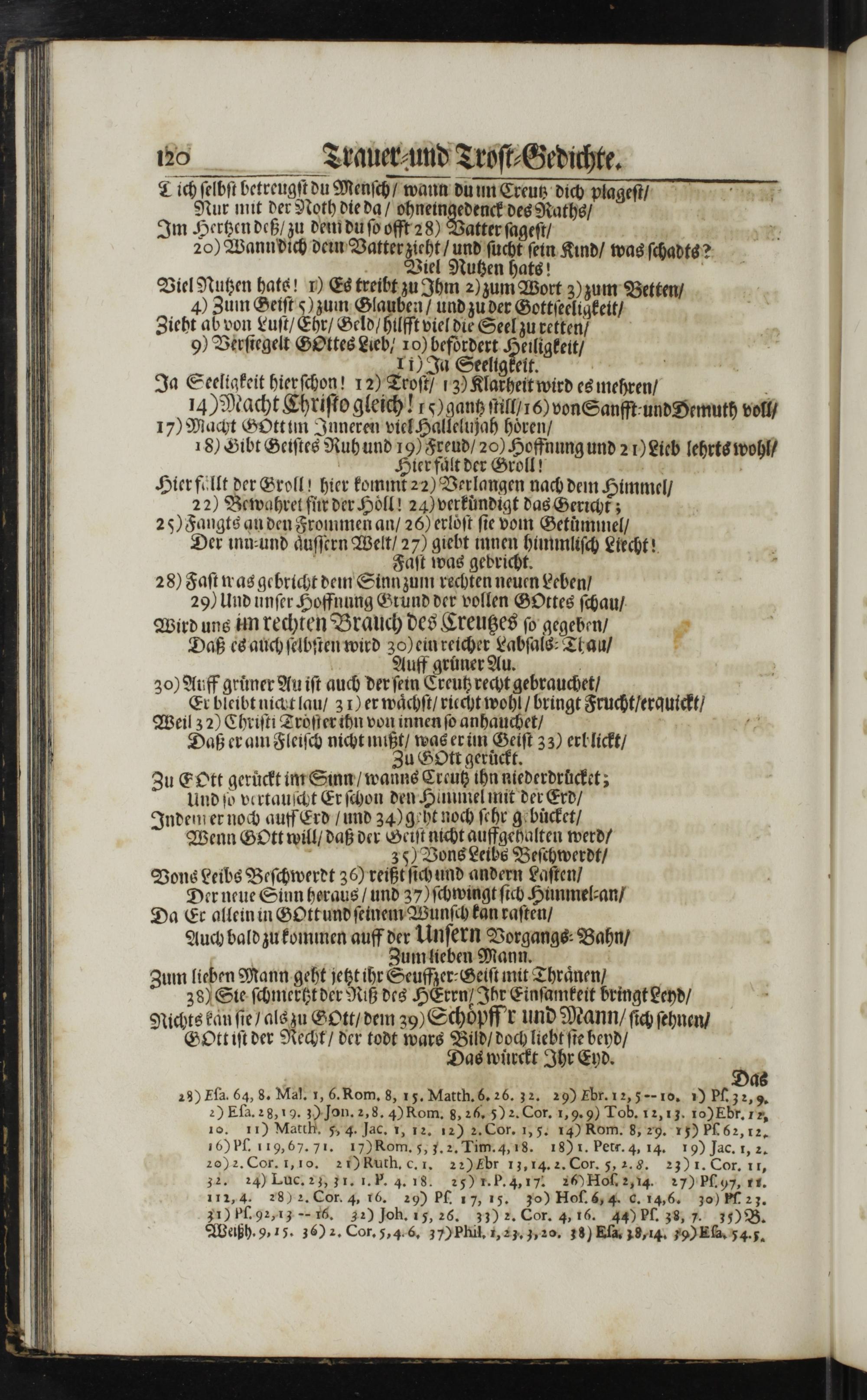 30) Auff gruͤner Au iſt auch der ſein Creutz recht gebrauchet/ Er bleibt nicht lau/ 31) er waͤchſt/ riecht wohl/ bringt Fruchtferquickt/ Weil 32) Chriſti Troͤſter ihn von innen ſo anhauchet/ Daß er am Fleiſch nicht mißt/ was er im Geiſt 33) erblickt/ Zu GOtt geruͤckt. Zu EOtt geruͤckt im Sinn/ wanns Creutz ihn niederdrucket; Und ſo vertauſcht Er ſchon den Himmel mit der Erd/ Indem er noch auff Erd/ und 34) geht noch ſehr gebucket/ Wenn Gott will/ daß der Geiſt nicht auffgehalten werd/ 35) Vons Leibs Beſchwerdt/ Vons Leibs Beſchwerdt 36) reißt ſich und andern Laſten/ Der neue Sinn heraus/ und 37) ſchwingt ſich Hunmel⸗an/ Da Er allein in GOtt und ſeinem Wunſch kan raſten/ Auch bald zu kommen auff der Unſern Vorgangs⸗Bahn/ Zum lieben Mann. Zum lieben Mann geht jetzt ihr Seuffzer⸗Geiſt mit Thraͤnen 38) Sie ſchmertzt der Riß des HErrn/ Ihr Einſamkeit bringt Leyd/ Nichts kan ſie als zu Gott/ dem 39) Schoͤpff r und Mann/ ſich ſehnen/ GOtt iſt der Recht/ der todt wars Bild/ doch liebt ſie beyd/ Das wuͤrckt Ihr Eyd.— as