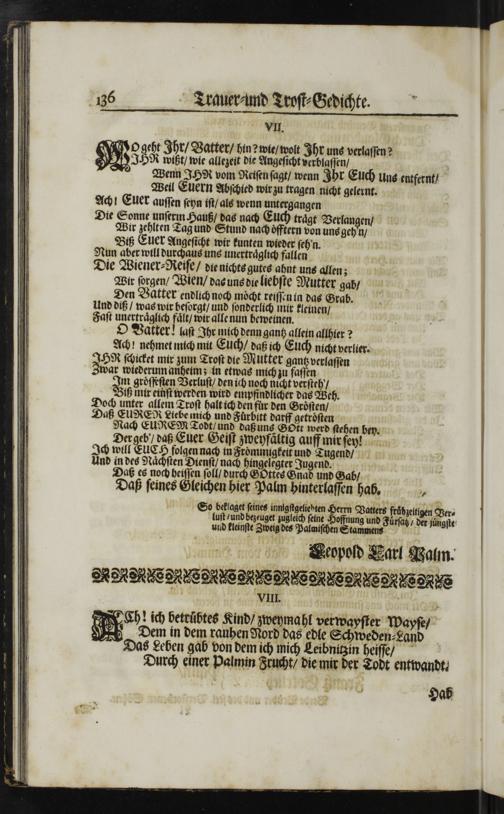 136 Trauer⸗-und Troſt⸗Gedichte. 1 VII. Ogeht Ihr/ Vatter/ hin? wie/ wolt Ihr uns verlaſſen? 8* Sir⸗ wie Wech die Hemat Jhruns 1 Wenn IHR vom Reiſen ſagt/ wenn Ihr Euch uns entfernt/ Weil Euern Abſchied wir zu tragen nicht gelernt.. Ach! Euer auſſen ſeyn iſt/ als wenn untergangen Die Sonne unſerm Hauß/ das nach Euch traͤgt Verlangen/ Wir zehlten Tag und Stund nachoͤfftern von uns gehyn/ Biß Euer Angeſicht wir kunten wieder ſehn. Nun aber will durchaus uns unertraͤglich fallen Die Wiener⸗Reiſe/ die nichts gutes ahnt uns allen; Wir ſorgen/ Wien/ dac uns die liebſte Mutter gab Den Vatter endlich noch moͤcht reiſſen in das Grab.