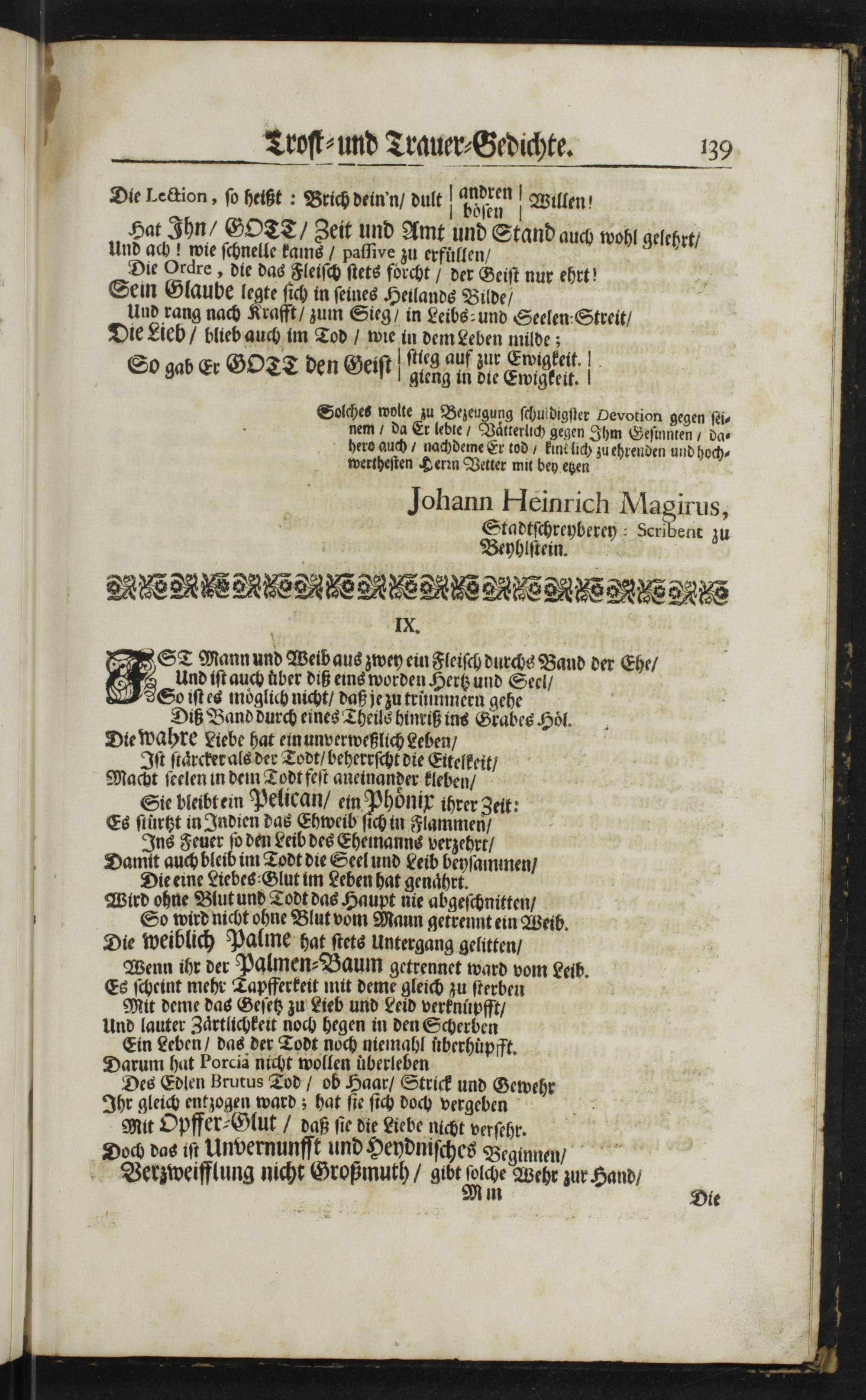 Die Ordre, die das Fleiſch ſtets forcht/ der Geiſt nur ehrt! Sein Glaube legte ſich in ſeines Heilands Bilde/