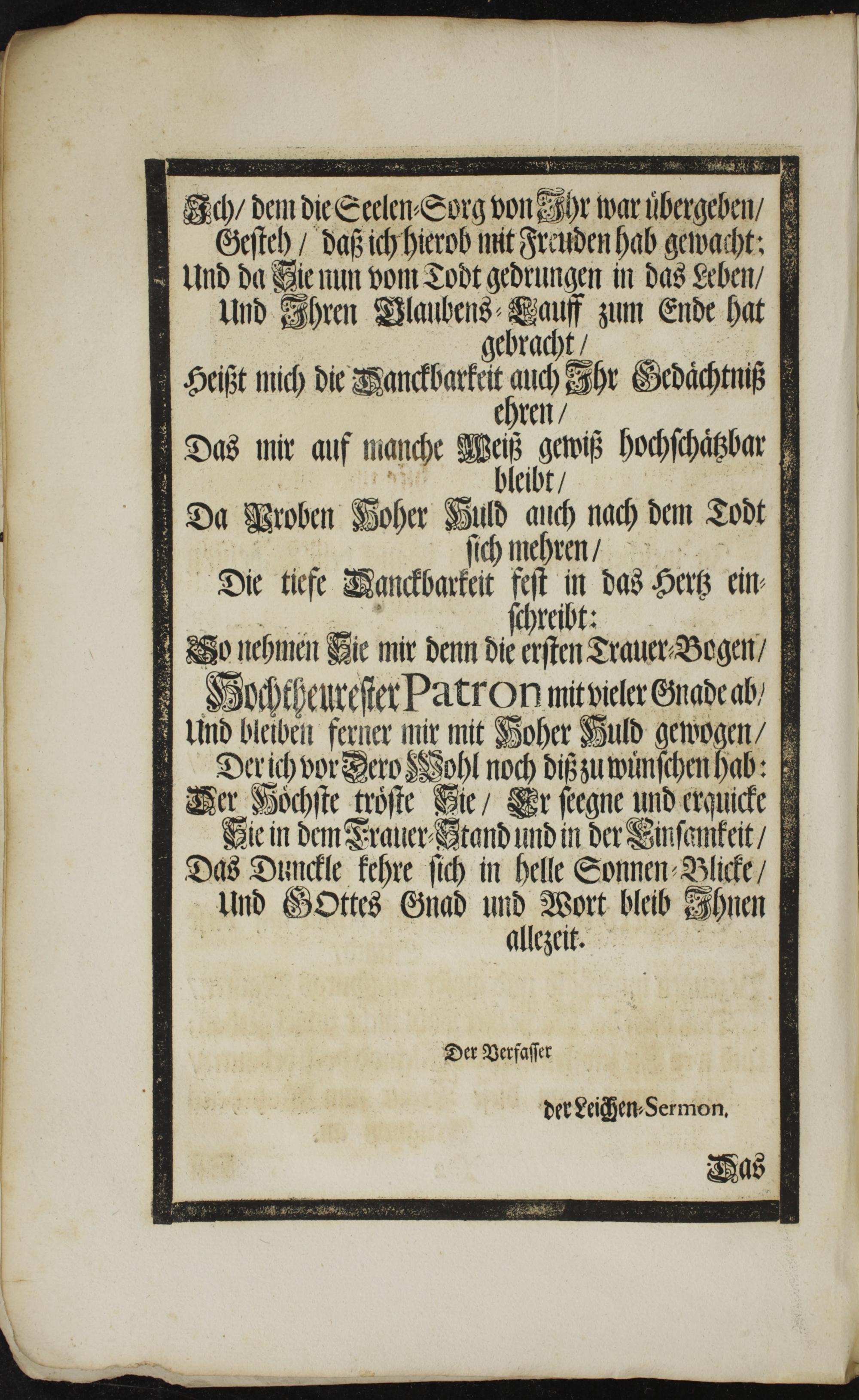 Sch/ dem die Seelen⸗Sorg von Ihr war üͤbergeben/ Geſtch/ daß ich hierob mit Freuden hab gewacht; 5und da Hie nun vom Todt gedrungen in das Leben/ 1 und Ihren Wlaubens⸗ Wauf zum Ende hat gebracht/ Heißt mich die Danckbarkeit 8 Ihr Gedaͤchtnis ehren/ Das mir auf manche Weis gewis hochſchäͤtzbar An eibt/ (Da Proben Hoher Huld auch nach dem Todt ſic mehren // Ddiie tiefe Wanckbarkeit fiſ 3 das Hertz ein⸗ DVo nehmen Hie mir denn die erſten Trauer⸗Bogen/ HGochtheureſter PatrOn mit vieler Gnade ab’ und bleiben ferner mir mit Hoher Huld gewogen/ Derich vor Dero Wohl noch dißzuwuͤnſchenhab: Der Hochſte troͤſte Sie/ Sr ſeegne und erquicke Kie in dem Trauer⸗Gtand undin der Sinſamkeit/ Das Dunckle kehre ſich in helle Sonnen⸗Blicke/ und GOttes Gnad und Wort bleib Ihnen 8 allezett.