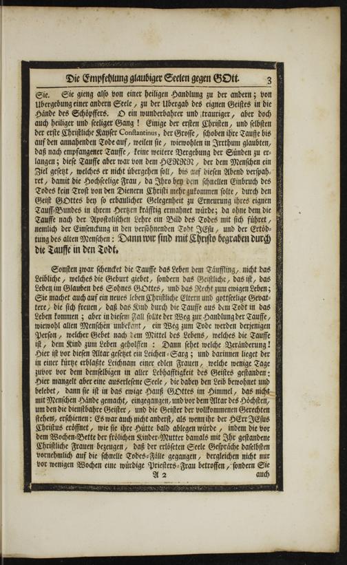 Sie. Sie gieng alſo von einer heiligen Handlung zu der andern; von Ubergebung einer andern Seele, zu der Ubergab des eignen Geiſtes in die Haͤnde des Schoͤpffers. O ein wunderbahrer und trauriger, aber doch auch heiliger und ſeeliger Gang! Einige der erſten Chriſten, und ſelbſten der erſte Chriſtliche Kayſer Conſtantinus, der Groſſe, ſchoben ihre Tauffe bis auf den annahenden Tode auf, weilen ſie, wiewohlen in Irrthum glaubten, daß nach empfangener Tauffe, keine weitere Vergebung der Suͤnden zu er⸗ langen; dieſe Tauffe aber war von dem HERRN, der dem Menſchen ein Ziel geſetzt, welches er nicht uͤbergehen ſoll, bis auf dieſen Abend verſpah⸗ ret, damit die Hochſeelige Frau, da Ihro bey dem ſchnellen Einbruch des Todes kein Troſt von den Dienern Chriſti mehr zukommen ſolte, durch den 4 Geiſt GOttes bey ſo erbaulicher Gelegenheit zu Erneurung ihres eignen 4 Tauff⸗Bundes in ihrem Hertzen kraͤfftig ermahnet wuͤrde; da ohne dem die Tauffe nach der Apoſtoliſchen Lehre ein Bild des Todes mit ſich fuͤhret, nemlich der Einſenckung in den verſohnenden Todt JEſu, und der Ertoͤd⸗ tung des alten Menſchen: Dann wir ſind mit Ehannd Gepraben durch 4