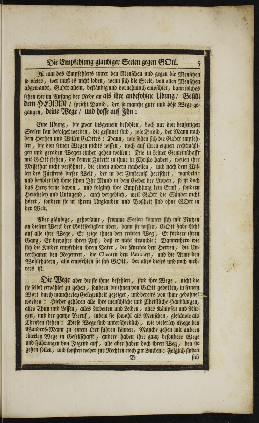 Aber glaͤubige, gehorſame, fromme Seelen koͤnnen ſich mit Nuten an dieſem Werck der Gottſeeligkeit uͤben, dann ſie wiſſen, GOtt habe Acht auf alle ihre Wege, Er zeige ihnen den rechten Weg, Er foͤrdere ihren Gang, Er bewahre ihren Fuß, daß er nicht ſtrauchle: Dannenhero wie ſich die Kinder empfehlen ihrem Vater, die Knechte den Herren, die Un⸗ terthanen den Regenten, die Clienten den Patronen, und die Arme den Wohlthaͤtern, alſo empfehlen ſie ſich GOtt, der alles dieſes und doch meh⸗ rers iſt.