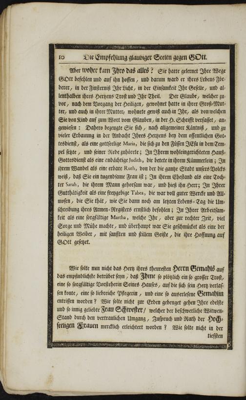 Wie ſolte nun nicht das Hertz ihres theureſten Herrn Gemahls auf das empfindlichſte betruͤbet ſeyn, daß Ihme ſo ploͤtzlich ein ſo groſſer Troſt, eine ſo ſorgfältige Vorſteherin Seines Hauſes, auf die ſich ſein Hertz verlaſ⸗ 1 ſen konte, eine ſo liebreiche Pflegerin, und eine ſo auserleſene Gemahlin entriſſen worden? Wie ſolte nicht zur Erden gebeuget gehen Ihre edelſte 1 und ſo innig geliebte Frau Scchweſter/ welcher der beſchwerliche Witwen⸗ Stand durch den vertraulichen Umgang, Zuſpruch und Rath der Hoch⸗ ſeeligen Frauen mercklich erleichtert worden? Wie ſolte nicht in der u 1 tiefſten