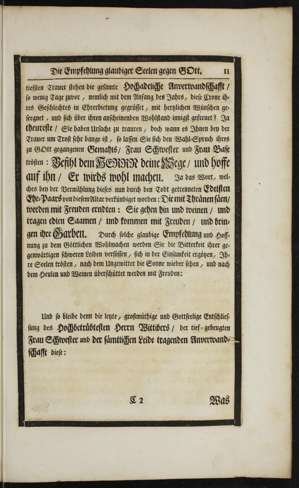 Und ſo bleibe denn die letzte, großmuͤthige und Gottſeelige Entſchlieſ⸗ ſung des Hochbetruͤbteſten Herrn Wittibers/ der tief⸗gebeugten Frau Schweſter und der ſaͤmtlichen Leide tragenden Anverwand⸗ ſchafft dieſe:
