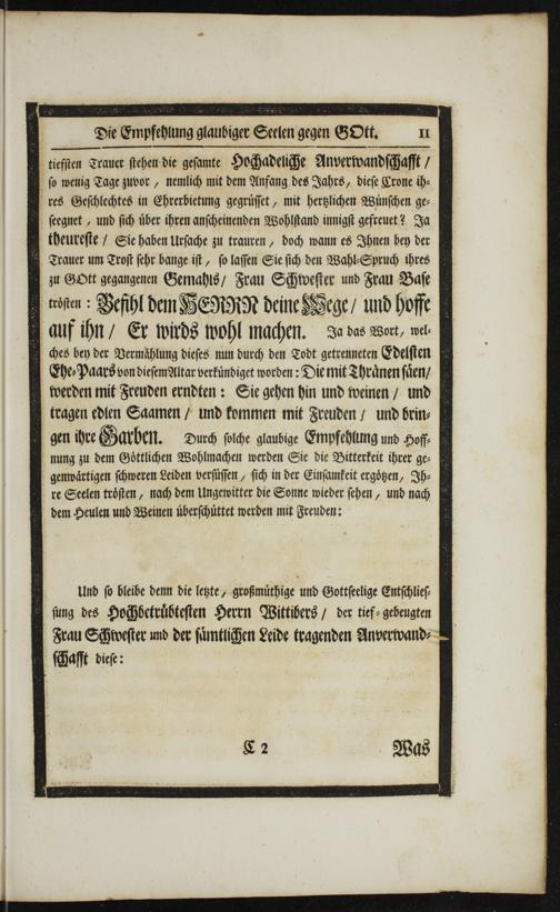 tiefſten Trauer ſtehen die geſmte Hochadeliche Anverwandſchafft/ ſo wenig Tage zuvor, nemlich mit dem Anfang des Jahrs, dieſe Crone ih⸗ . res Geſchlechtes in Ehrerbietung gegruͤſſet, mit hertzlichen Wuͤnſchen ge⸗ ſeegnet, und ſich uͤber ihren anſcheinenden Wohlſtand innigſt gefreuet? Ja theureſte/ Sie haben Urſache zu trauren, doch wann es Ihnen bey der Trauer um Troſt ſehr bange iſt, ſo laſſen Sie ſich den Wahl⸗Spruch ihres zu GOtt gegangenen Gemahls/ Frau Schhweſter und Frau Baſe