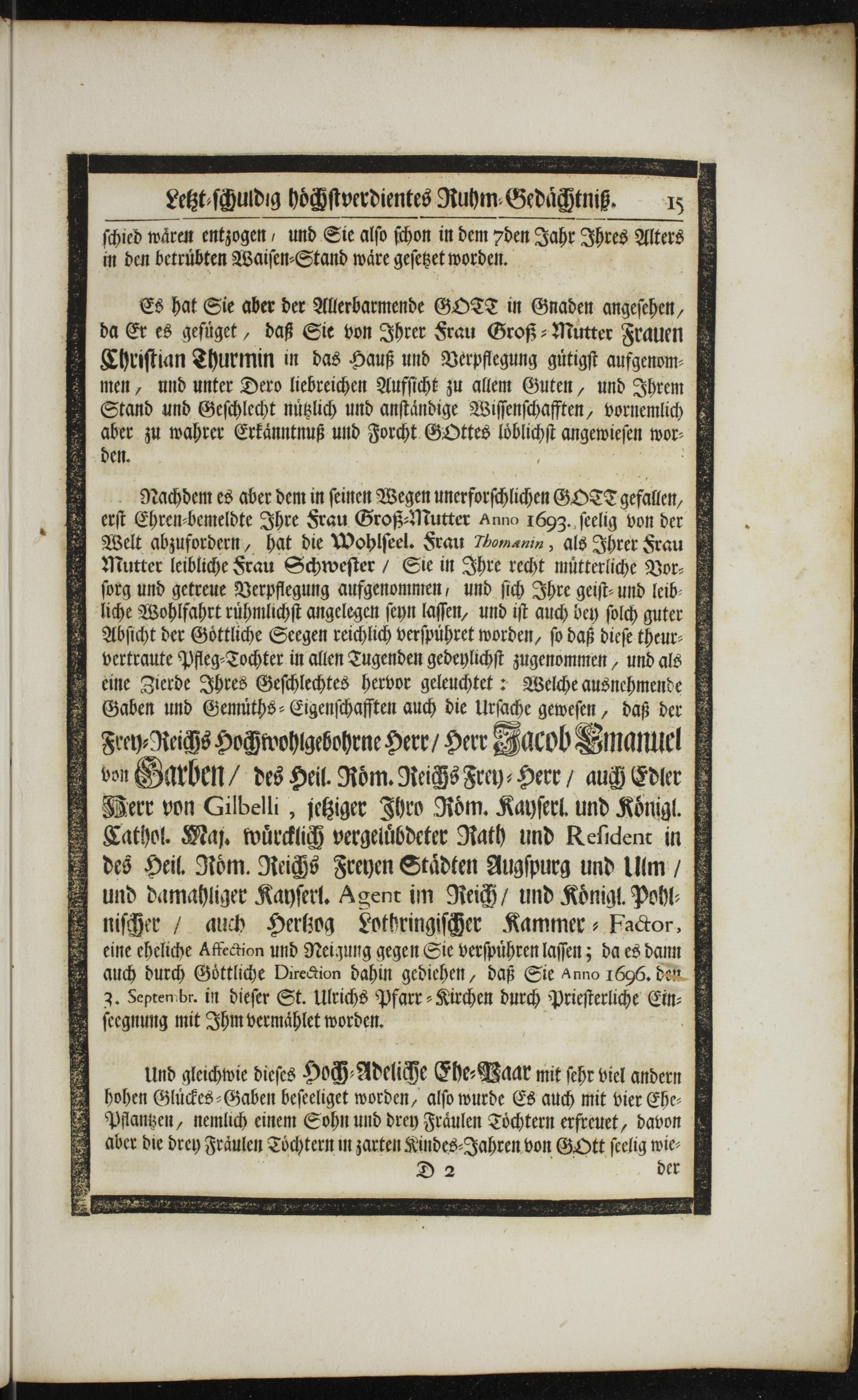 Nachdem es aber dem in ſeinen Wegen unerforſchlichen GOTT gefallen, erſt Ehren⸗bemeldte Ihre Frau Groß⸗Mutter Anno 1603. ſeelig von der Welt abzufordern, hat die Wohlſeel. Srau Tbomanin, als Ihrer Srau Mutter leibliche Frau Schweſter/ Sie in Ihre recht muͤtterliche Vor⸗ ſorg und getreue Verpflegung aufgenommen, und ſich Ihre geiſt⸗ und leib⸗ liche Wohlfahrt ruͤhmlichſt angelegen ſeyn laſſen, und iſt auch bey ſolch guter Abſicht der Goͤttliche Seegen reichlich verſpuͤhret worden, ſo daß dieſe theur⸗ vertraute Pfleg⸗Tochter in allen Tugenden gedeylichſt zugenommen, und als 3 eine Zierde Ihres Geſchlechtes hervor geleuchtet: Welche ausnehmende 8 1 Gaben und Gemuͤths⸗Eigenſchafften auch die uſiche geweſen, daß der 5 SFrey⸗Reichs Hochwohlgebohrne Herr/ Herr Jacob Gmanuel 4 on Garben/ des Heil. Rom. Reichs Frey⸗Herr/ auch Edler MWVerr von Gilbelli, jetziger Ihro Roͤm. Kayſerl. und Koͤnigl. 4 KCathol. Maj. wuͤrcklich vergeluͤbdeter Rath und Reſident in des Heil. Roͤm. Reichs Freyen Staͤdten Augſpurg und Um/ und damahliger Kayſerl. Agent im Reich/ und Koͤnigl. Pohl⸗ niſcher/ auch Hertzog Lothringiſcher Kammer⸗ Factor, eiine eheliche Affection und Neigung gegen Sie verſpuͤhren laſſen; da es dann