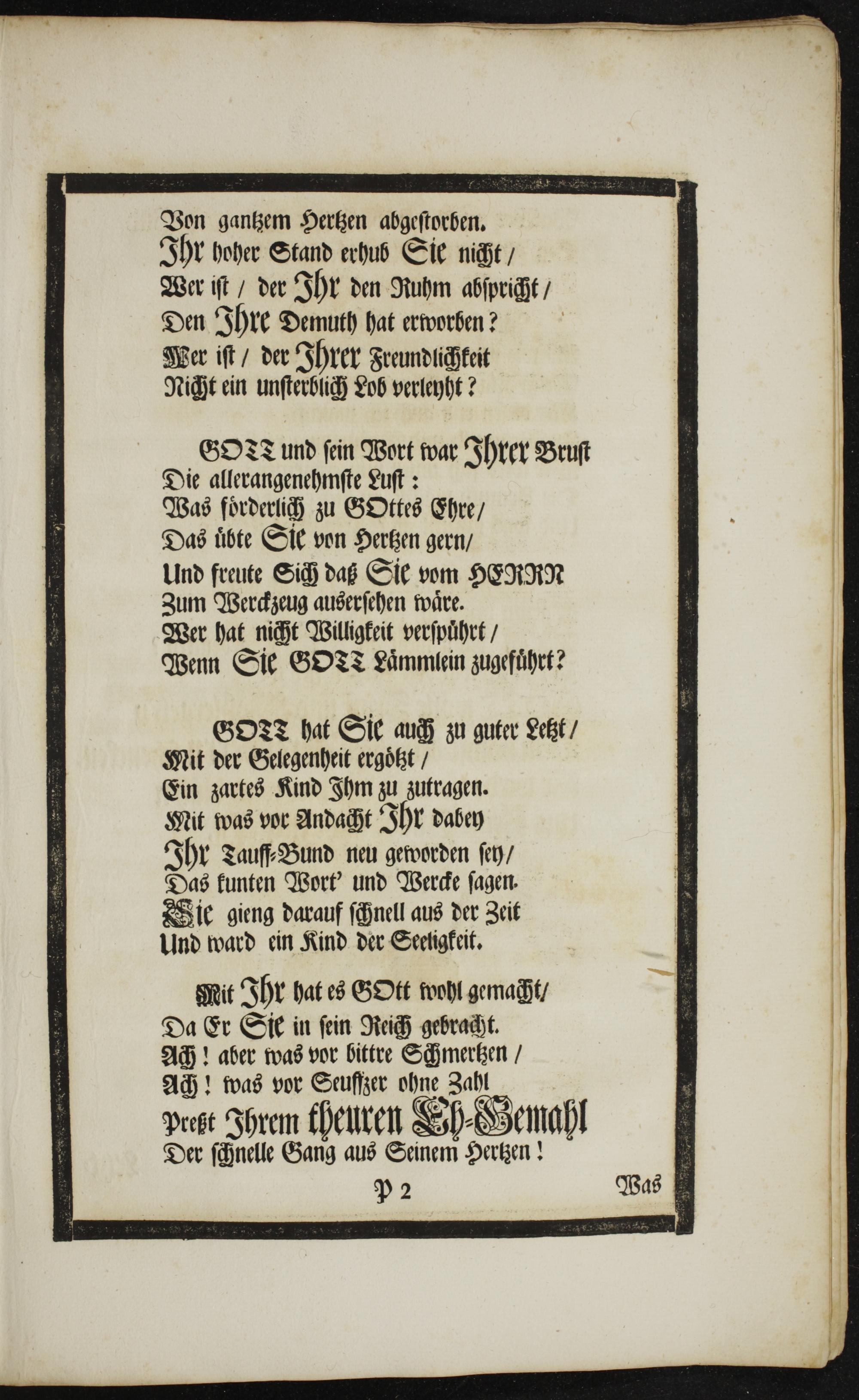 GOT und ſein Wort war Ihrer Bruſt Die allerangenehmſte Luſt: Was foͤrderlich zu GOttes Ehre/ Das uͤbte Sie von Hertzen gern/ Und freute Sich das Sie vom HERRN Zum Werckzeug auserſehen waͤre. Wer hat nicht Willigkeit verſpuͤhrt/ Wenn Sie GO?TT Laͤmmlein zugefuͤhrt?