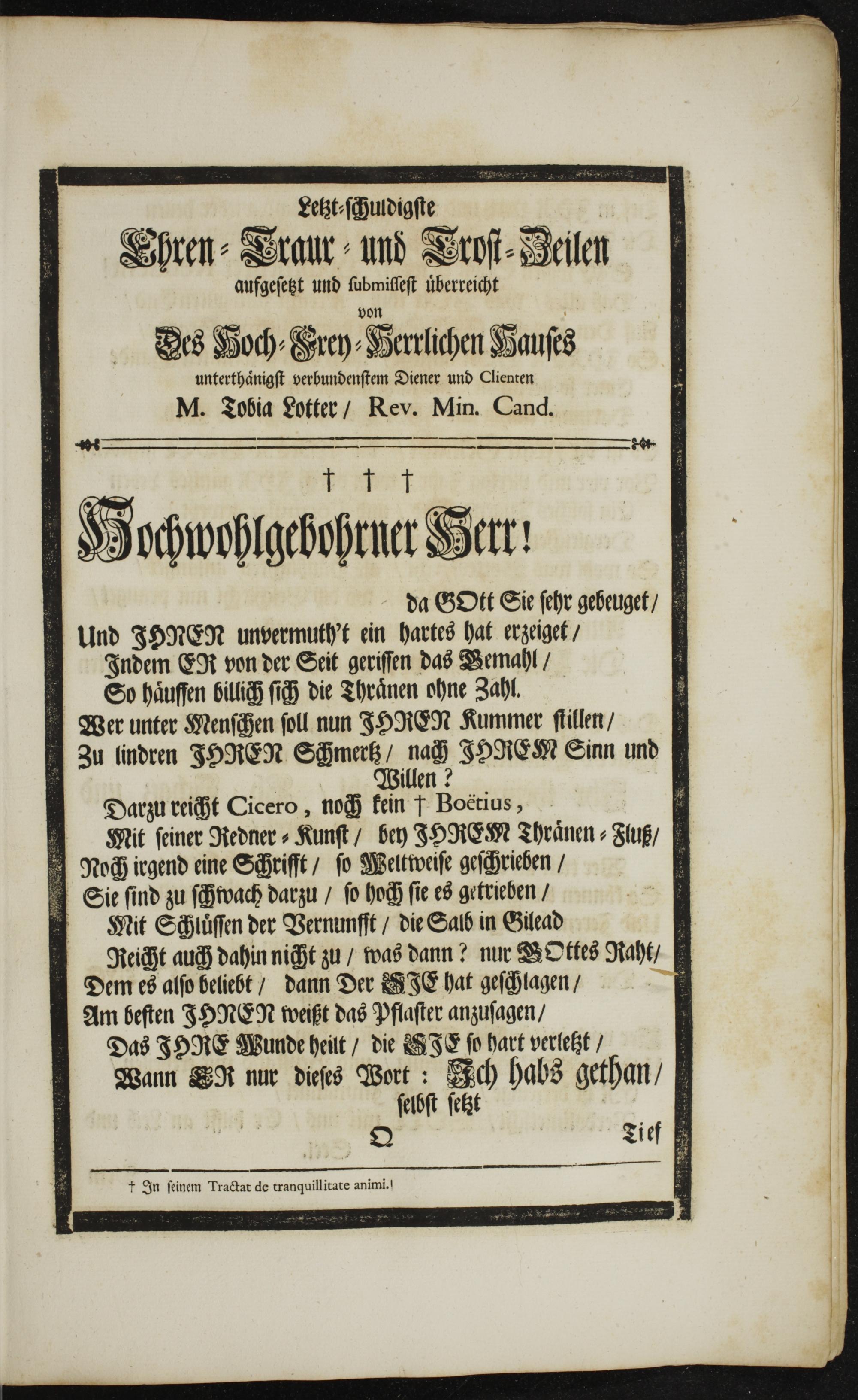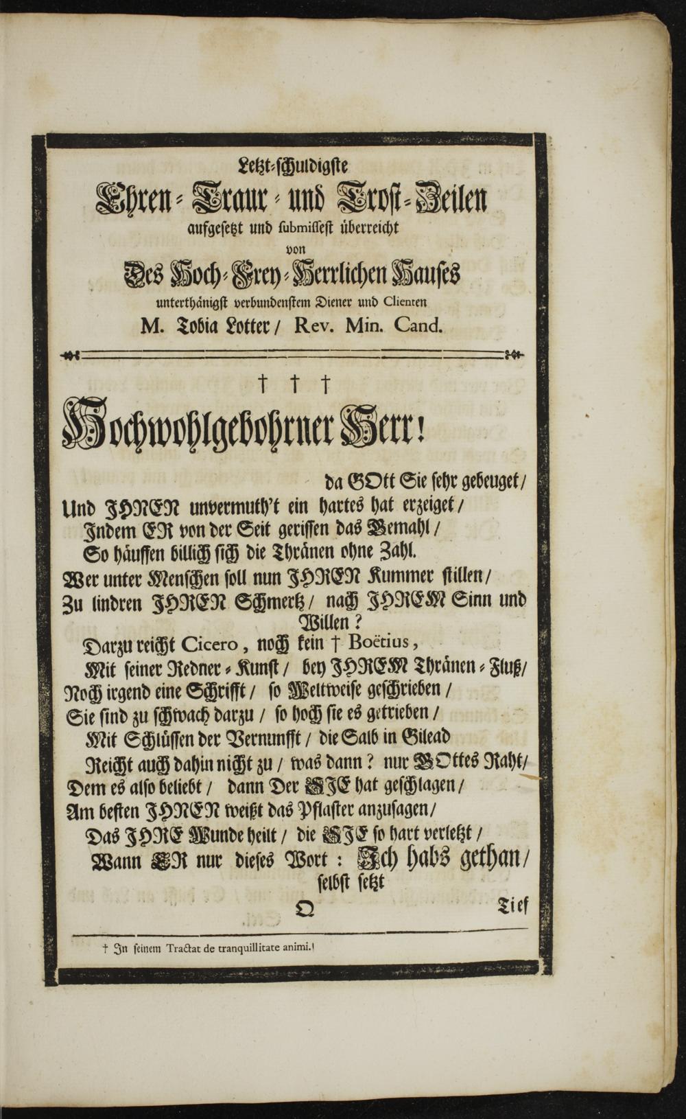 Darzu reicht Cicero, noch kein Boëtius, 4 Mit ſeiner Redner⸗Kunſt/ bey ISORER Thraͤnen⸗Fluß/ Noch iegend eine Schrifft/ ſo Weltweiſe geſchrieben/ Sie ſind zu ſchwach darzu/ ſo hoch ſie es getrieben/