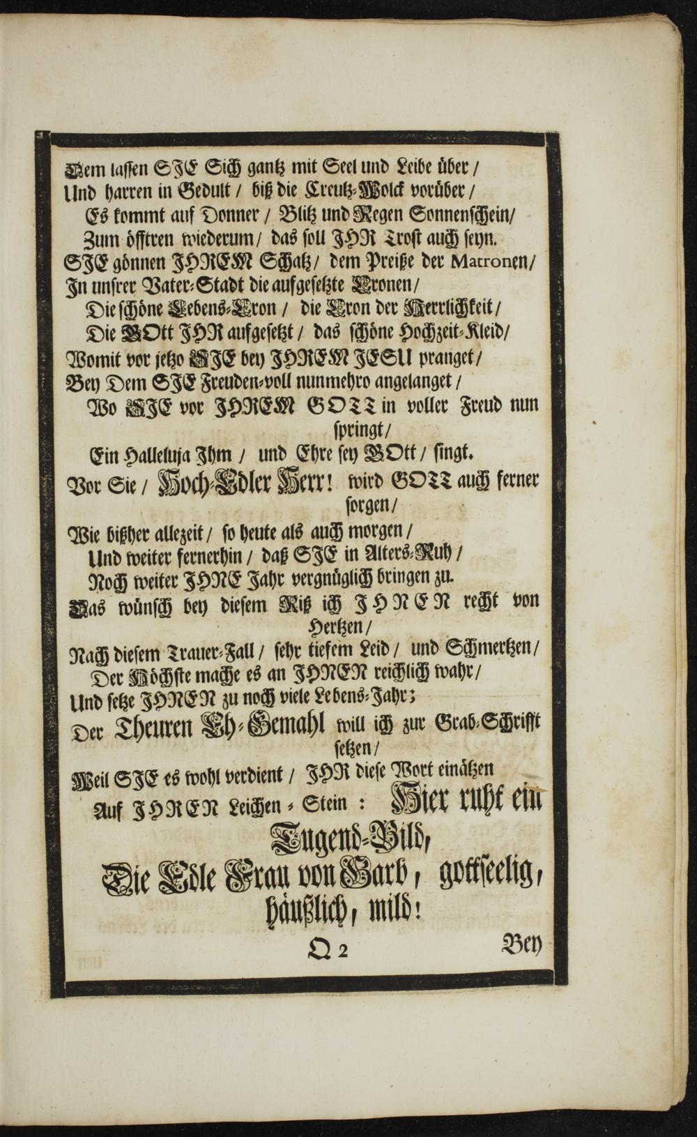 Wie bißher allezeit/ ſo heute als auch morgen/ Und weiter fernerhin/ daß SIFE in Alters⸗Ruh/ Noch weiter 3ONE Jahr vergnuͤglich bringen zu. Das wuͤnſch bey dieſem Riß ich JH N E N recht von 8 Hertzen,/ Nacc dieſem Trauer⸗Fall/ ſehr tiefem Leid/ und Schmertzen/ Der Koͤchſte mache es an JHNEN reichlich wahr/ unrd ſetze JONE N zu noch viele Lebens⸗Jahr; Der Theuren Sh⸗Gemahl. ich zur Grab⸗Schrifft 4 ſetzen/ Weil S IE es wohl verdient/ IOR dieſe Wort einaͤtzen