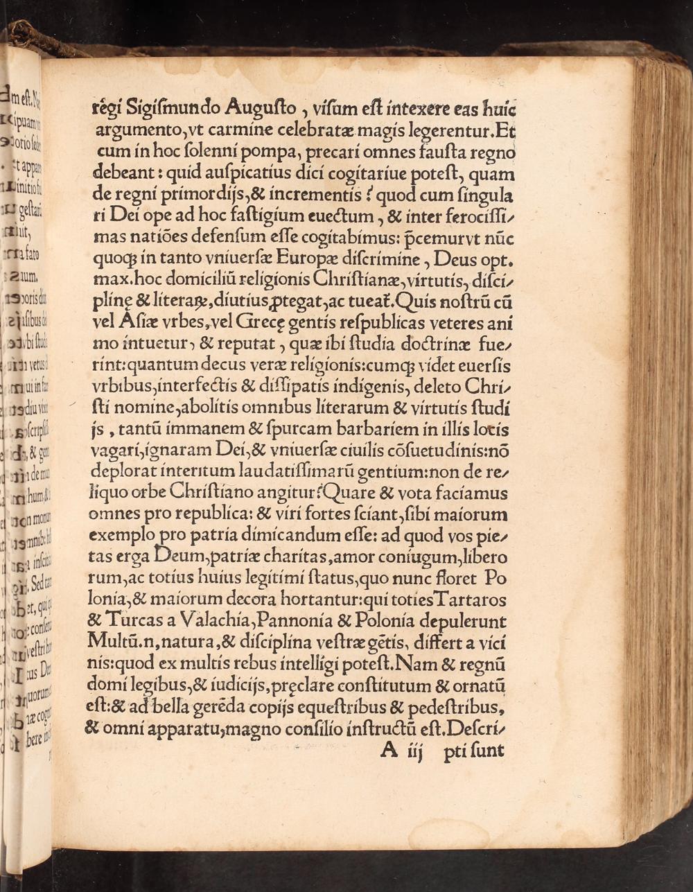 règi Sigiſmundo Auguſto, viſum eſt intexere eas huic argumento, vt carmine celebratæ magis legerentur. Et cum in hoc ſolenni pompa, precari omnes fauſta regno debeant: quid auſpicatius dici cogitariue poteſt, quam de regni primordijs,& incrementis? quod cum ſingula ri Dei ope ad hoc faſtigium euectum,& inter ferociſſi/ mas natiões defenſum eſſe cogitabimus: pᷣcemurvt nũc quoq; in tanto vniuerſæ Europæ diſcrimine, Deus opt. max.hoc domiciliũ religionis Chriſtianæ, virtutis, diſci- plinę& literaꝶ, diutius ꝓtegat) ac tueat᷑. Quis noſtrũ cũ vel Aſiæ vrbes, vel Grecę gentis reſpublicas veteres ani mo intuetur,& reputat, quæ ibi ſtudia doctrinæ fue- rint: quantum decus veræ religionis: cumq; videt euerſis vrbibus,interfectis& diſſipatis indigenis, deleto Chri- ſti nomine) abolitis omnibus literarum& virtutis ſtudi js, tantũ immanem& ſpurcam barbariem in illis lovis vagari, ignaram Dei,& vniuerſæ ciuilis cõſuetudinis: nõ deplorat intertum laudatiſſimarũ gentium: non de re/ liquo orbe Chriſtiano angitur? Quare& vota faciamus omnes pro republica:& viri fortes ſciant, ſibi maiorum exemplo pro patria dimicandum eſſe: ad quod vos pie/ tas erga Deum patriæ charitas, amor coniugum, libero rum ac totius huius legitimi ſtatus, quo nunc floret Po lonia,& maiorum decora hortantur: qui toties Tartaros & Turcas a Valachia, Pannonia& Polonia depulerunt Multũ.n, natura,& diſciplina veſtræ gètis, differt a vici nis: quod ex multis rebus intelligi poteſt. Nam& regnũ domi legibus,& iudicijs, pręclare conſtitutum& ornatũ eſt:& ad bella gerẽda copijs equeſtribus& pedeſtribus, & omni apparatu; magno conſilio inſtructũ eſt. Deſcri/