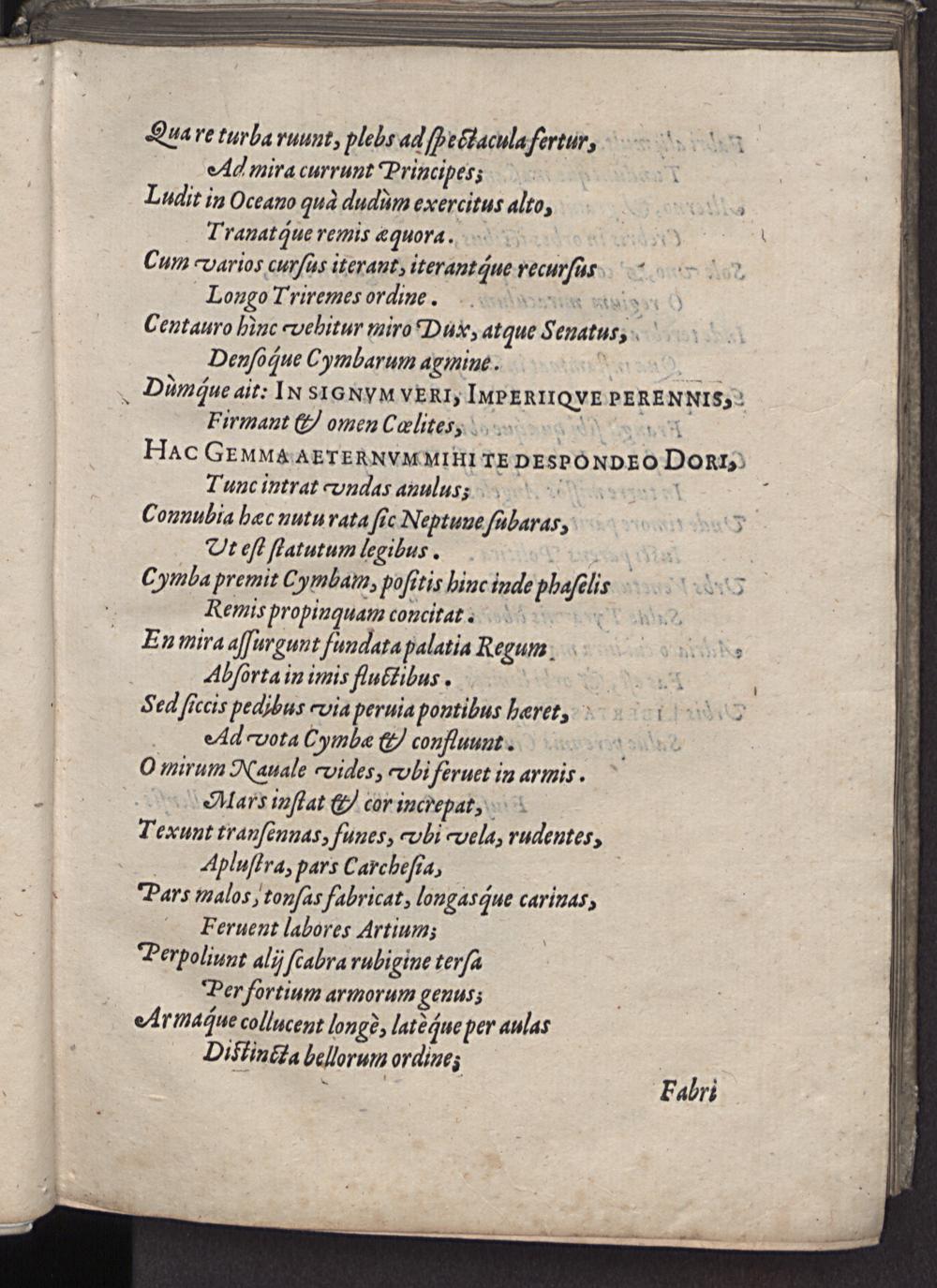 Qua re turba ruunt, plebsaa Heétaculafertuu,f Ad mira currunt Principes; W Ludit in Oceano quà dudum exercitus alto, e Tranatque remis æquora. Cum Varios curſas iterant, iterantque recurſun Longo Triremes oriic. ¹*² 8n Centauro hinc vebitur miro Dux, atque Senatus, Denſoczue C(ymbarum agmine. Duͤm qjue ait: IN SIGNVM VERNI, IMPERIIOQVE PERENNIS, Firmant& omen Cæliter, S HAC GEMMX AETERNVMMIHI TE DESPONDEODONRI, Tunc intrat vndas anulus, SRann— Connubia hæc nutu rata ſia Naptuue ſubaras, 5 Dt eſt ſtatutum legibusn. Suba premit Cymbam, poſitis hinc inde phaſelis