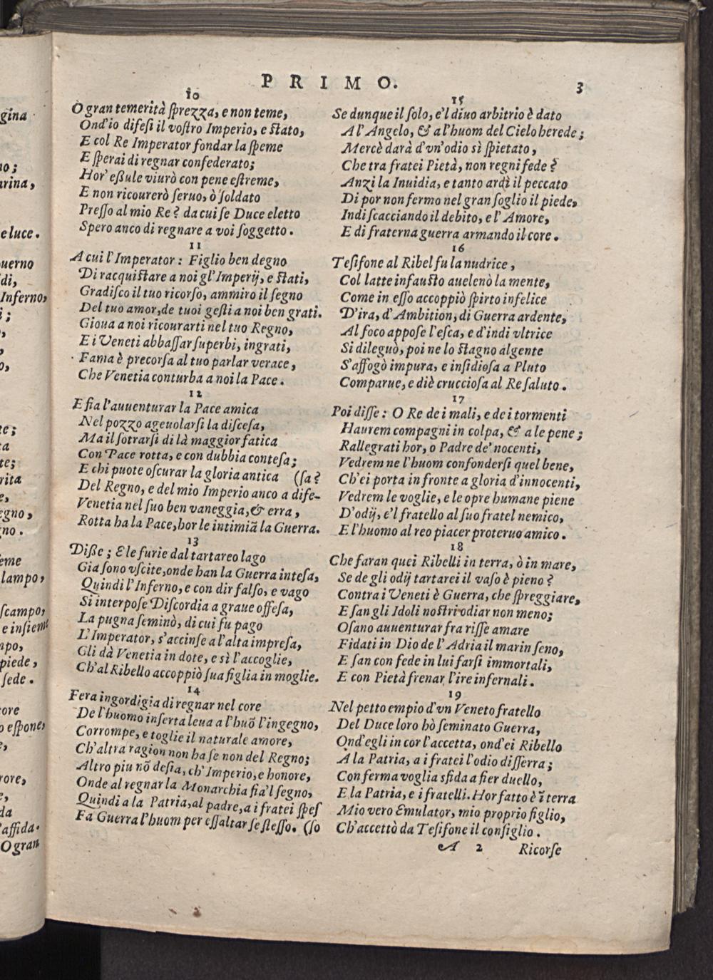 19 Nel petto empio d vn Veneto fratello Del Huce loro hò ſeminato Guerra, Ond egli in corl' accetta, ond'ei Ribello A la Patria, ai fratei lodio diſſerra; Con ferma voglia cfida a fier duello, Ela Patria, e i fratelli. Hor fattoè ⁊ terra Mio vero&mulator, mio proprio figlio, Ch'accettò da Teſifone il conſi glio. 1 2 Aicorſe