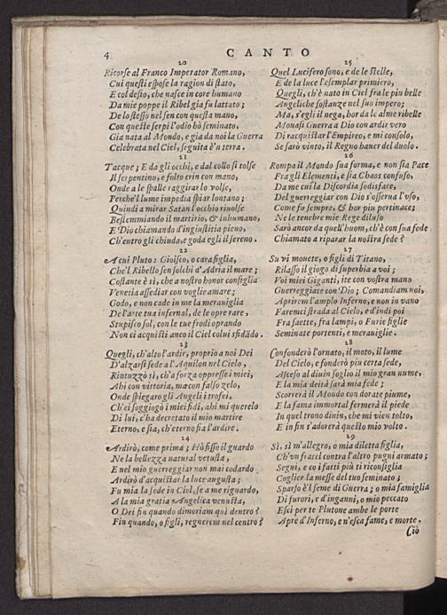 24 Ardirò, come prima; Hô fiſſo il guardo Ne la bellexa natural vetuſta, E nel mio guerreggiar non mai codardo Ardirò d'acqui ftar la luce auguſta; Fu mia la ſede in Ciel, ſe a me riguardo, A la mia gratia Angelica venufta, O Dei fin quando dimoriam qul dentro? Ein quando, o figli, reguerem nel centro?