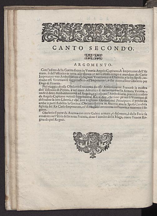 3 Obelerio ſi parte da Ancona con certe Galere armate, e dal vento, è dalle Furie fu condotto nell Iſola della noua Francia, doue è accolto dalla Maga, ouero Venere Re- gina di quel Regno.