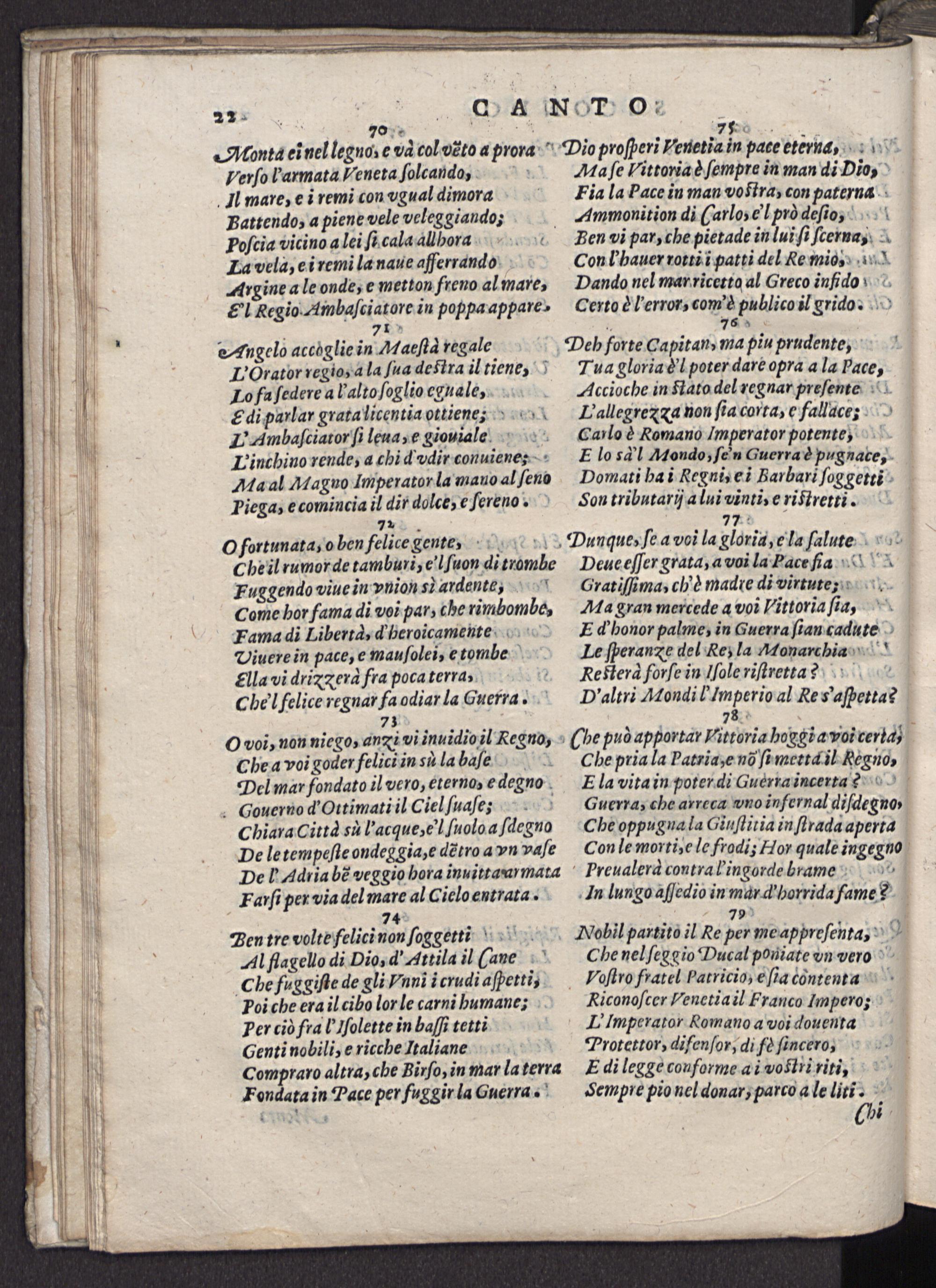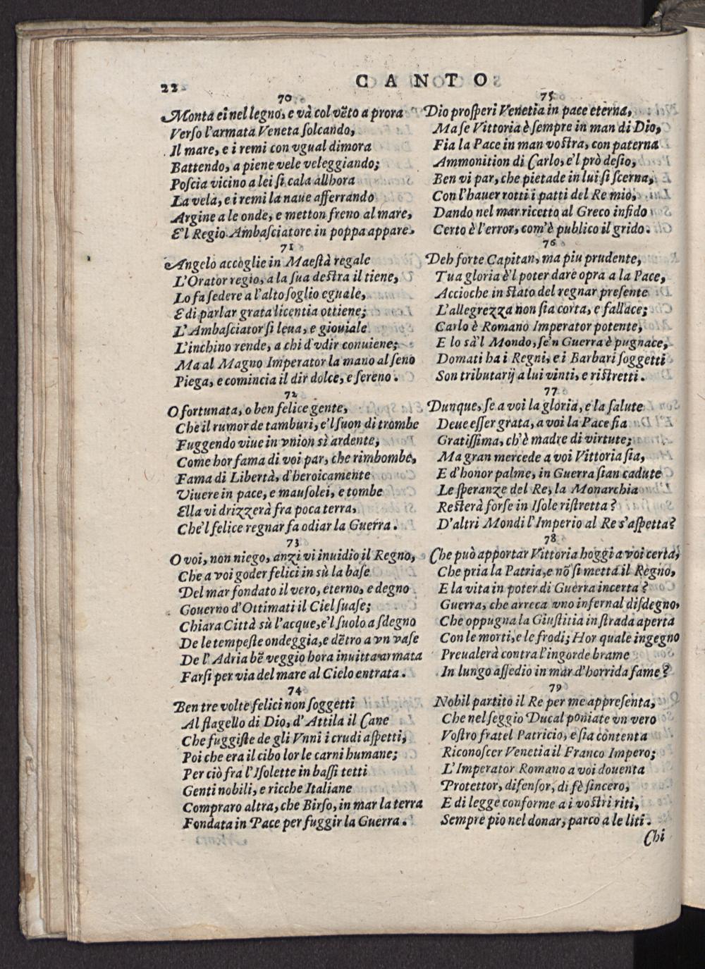 Deh forte Capitan, ma piu prudente,. Tua gloria d'i poter dare opra a la Pace, Accioche in Stato del regnar preſente Fallegrex a non ſia corta, e fallacc; Caulo è Romano Imperator potente, E lo sd'l Mtondo, ſein Guerra è pugnace, Domati ha i Regni, ei Barbari ſoggetti Son tributarij a lui vinti, e riſtretti.