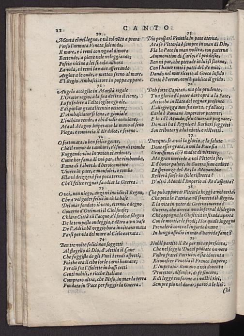 Deue eſſer grata, a voi la Pace ſia i Gratiſſima, ch'è madte di virtute; Ma gran mercede a voi Vittoria ſia, Ed'honor palme, in Guerra ſian cadute Le ſperanze del Res la Monarchia Reſterd forſe in Iſole riſtretta