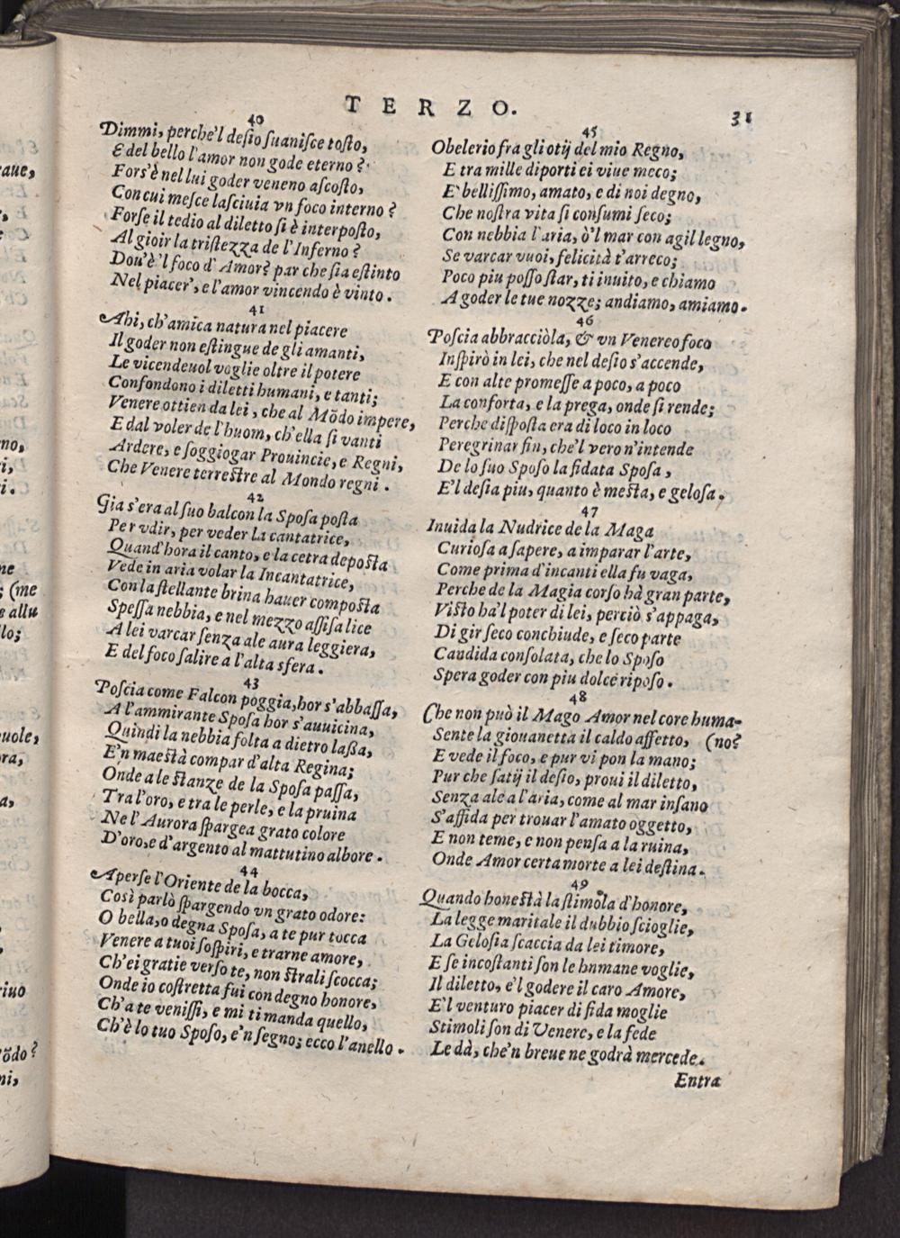 47 Obelerio fra gli otij del mio Regno, Etra mille diporti ei viue meco: E' belliſſimo, amato, e di noi degno, Che noſlra vita ſi conſumi ſeco, Con nebbia! aria, o¹ mar con agil legno, Se varcar vuoi, felicitd t arreco; Poco piu poſſo ſtar, ti inuito, e chiamo A goder le tue noxes andiamo, amiamo-