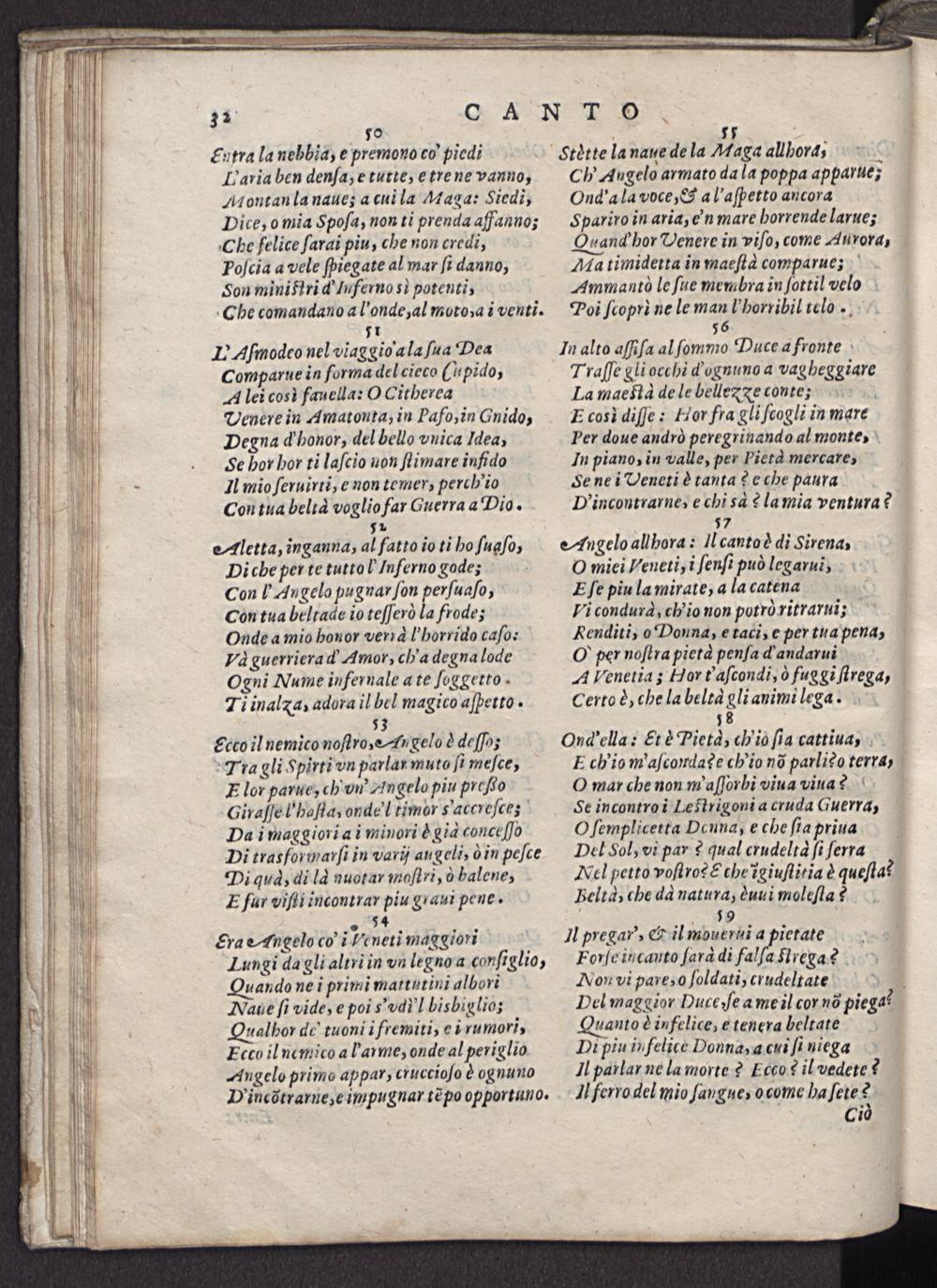 57 Angelo allhora: Il cantoò di Sirena, O miei Veneti, i ſenſi puo legarui, Eſe piu la mirate, a la catena Vi condura, ch'io non potrò ritrarui; Nenditi, o Donna, e taci, e per tua pena, O' per noſtra pietà penſa d andarui A Venetia; Hor t' aſcondi, fuggi ſtrega, Certo è, che la belta gli animi lega. 1⁸ Ond'ella? Etè Pietd, ch'io ſia cattiua, E ch'io m'aſcomlare ch'io nõ parliso terra, O mar che non m'aſſorbi viua viua? Se incontroi Leftrigoni a cruda Guerra, O ſemplicetta Deuna, e che ſia priua Del Sol, vi par? qual crudelta ſi ſerra Nel petto voſtro?& che ĩgiuſtitia è queſtat Belta, che da natura, èuui moleſta? 79 Il pregar',& il mouerui a pietate Forſe incauto ſard di falſa lrega? Non vi pare, o ſoldati, crudeltate Del maggior Duce ſe a me il cor nõ piegas Quauto è infelice, e tenera beltate Di piu infelice Donna, a cui ſi niega Il parlar ne la morte? Eoco? il vedete? Il ferro del mio ſangue, o come ha ſete? Cid