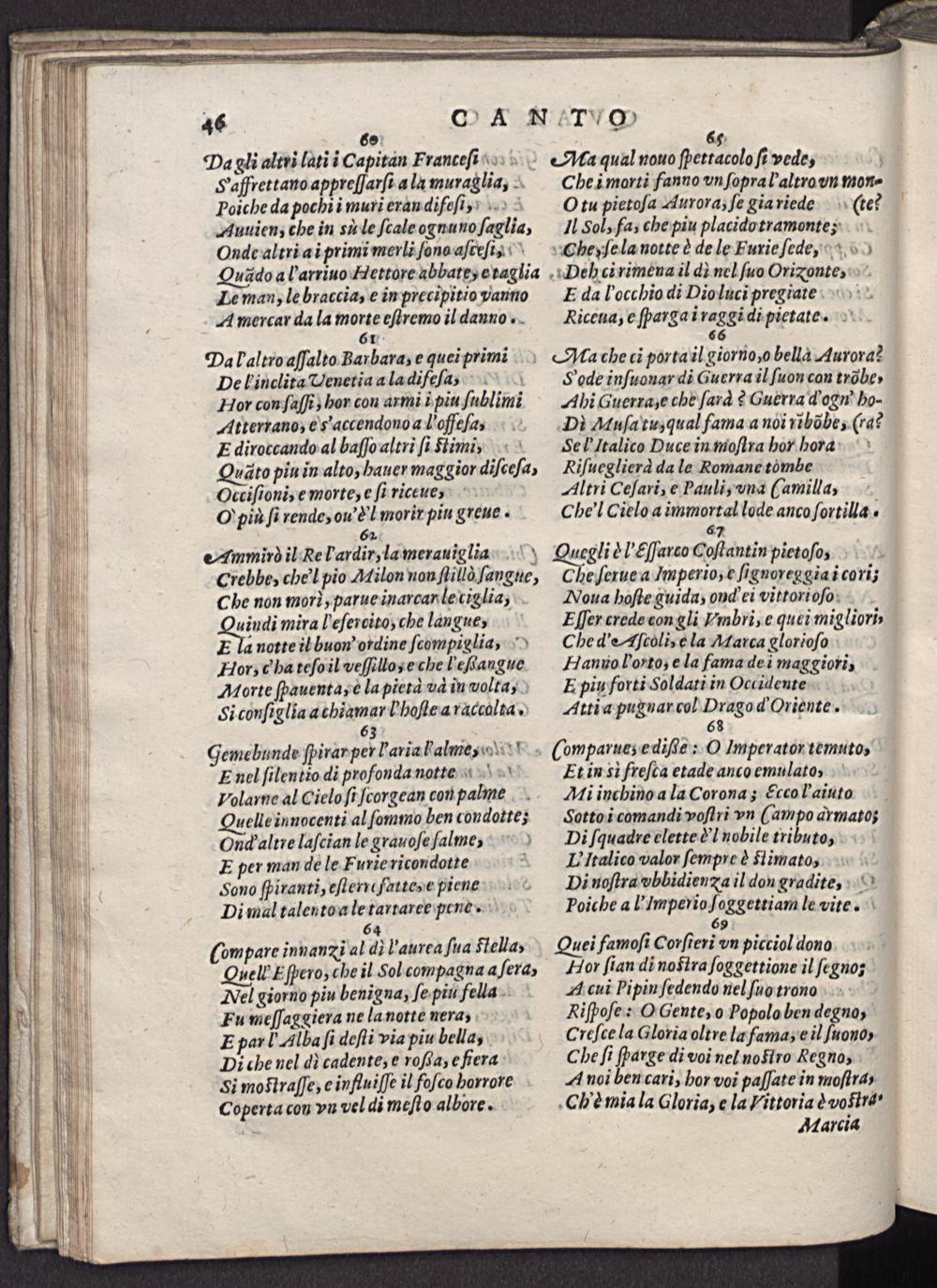 Da haltro aſſalto Barbara, e quei primi De linclita Venetia a la difeſa, Hor con ſaſſi, hor con armi i piu ſublimi Atterrano, e s'accendonoa l'offeſa, E diroccando al baſſo altri ſi ſtimi, Quãto piu in alto, hauer maggior diſceſa, Occiſioni, e morte, e ſi riceue, O pin ſi rende, ou'è'¹l morir pin greue.
