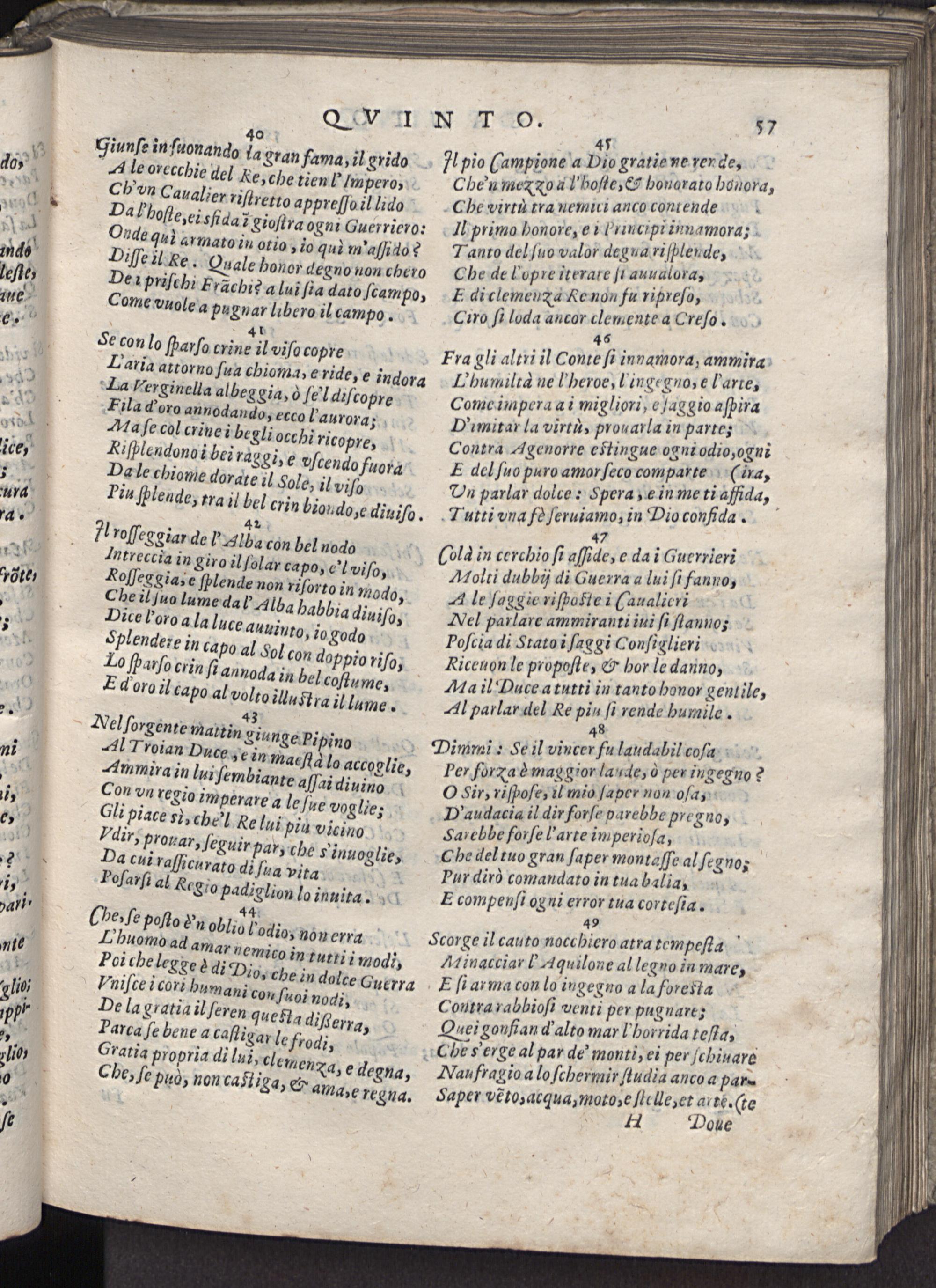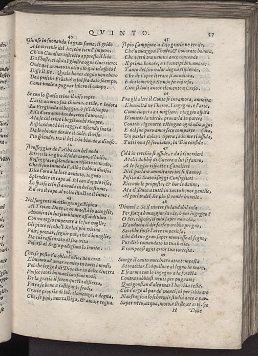 Per foraò magg ior laude, per ingegno? O Sir, riſpoſe, il mio ſaper non oſa, D'audacia il dir forſe parebhe pregno, Saiebbe forſel arte imperioſa, Che del tuo gran ſaper montaſſe al ſegno, Pur dirò comandato in tua balia, E compenſi ogni error tua corteſia.