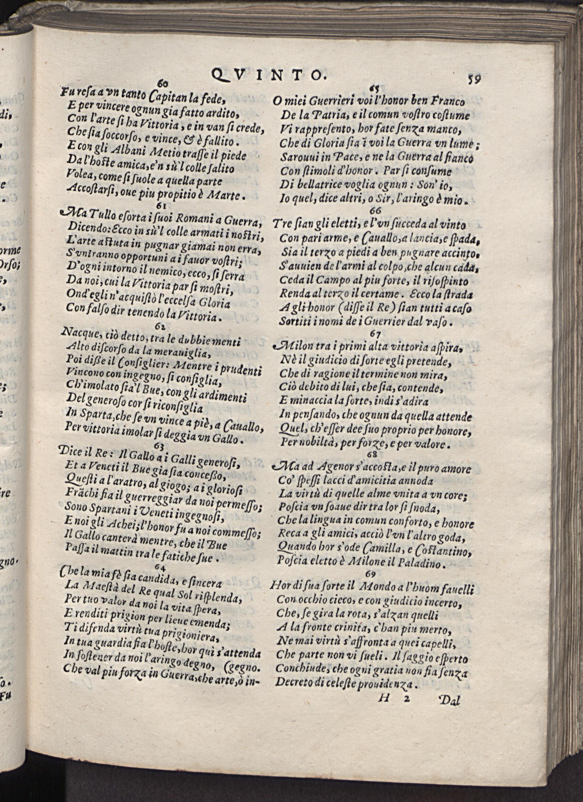 51 Ala Tullo eſorta i ſuoi Romani a Guerra, Dicen do:&cco in siſ colle armati ĩ noftri, Larte aftuta in bugnar giamai non erra, S'vntranno opportuni ai fauor voſtri, D'ogni intorno il nemico, ecco, ſi ſerra Da noi, cui la vittoria par ſi moſtri, Onqd egli n'acquiſidò Feccelſa Gloria Con falſo dir tenendo la Vittoria. 6² Nacque, cid detto, tra le dubhie mentz Alto diſcorſo da la merauiglia, Poi diſe il(onſigliere Atentre: prudenti Uincono con ingegno, ſi conſiglia, Cb'imolato ſiaꝰ Bue, con gli ardimenti Del generoſo cor ſi riconſ, glia In Sparta, che ſ*