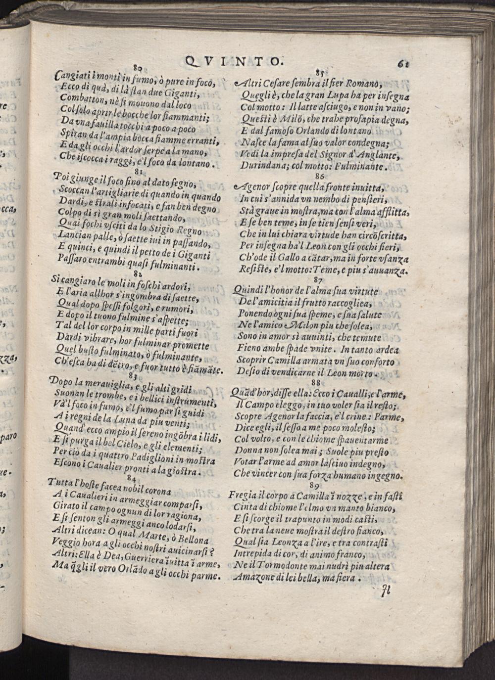 Quęgliè, chela gran Lupa ha per inſegna Col motto: Il latte aſciugo, e non in vano; Queiti Acilõ, che trabe proſapia degna, E dal famoſo Orlando di lontano. VNaſte la fama al ſuo valor condegna; Vedi la impreſa del Signor d Anglante, Durindana; col motto: Fulminante.