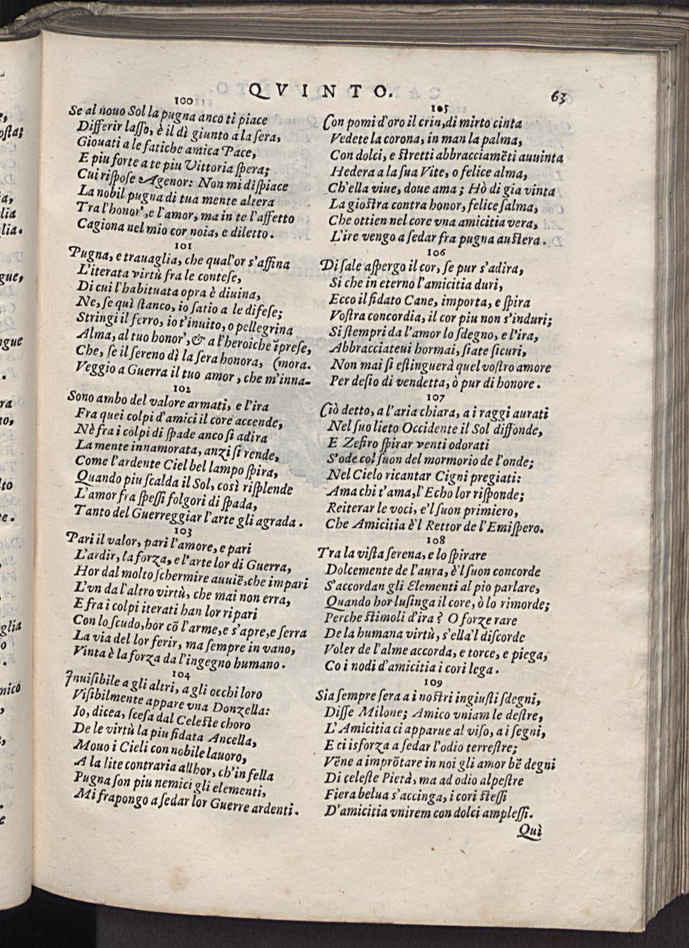 Vne a imprõtare in noi gli amor bè degni Di celeſle Pieta, ma ad odio alpeſtre Fiera helua s accinga, i cori fleſſi D'amicitia vnirem con dolci ampleſſ.
