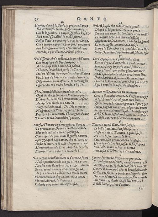 7⁰⁴ 40 Quinci, doue à lo Spoſo in propria ſtanxa Da Artemiſia celato, foręe vn lume, Che lo ingombra, e parldò: Queſtaꝰ l'vſaza De i prodi aualierꝰ in molli piume Paſſar l'otio, e nou ſcorgi, o vil tardanga, Che)l tempo a guetreggiar qul ſi conſume? Son Angelo custode; Hettorre al vino Intende, e par di lume, e ſenſo priuo. 1