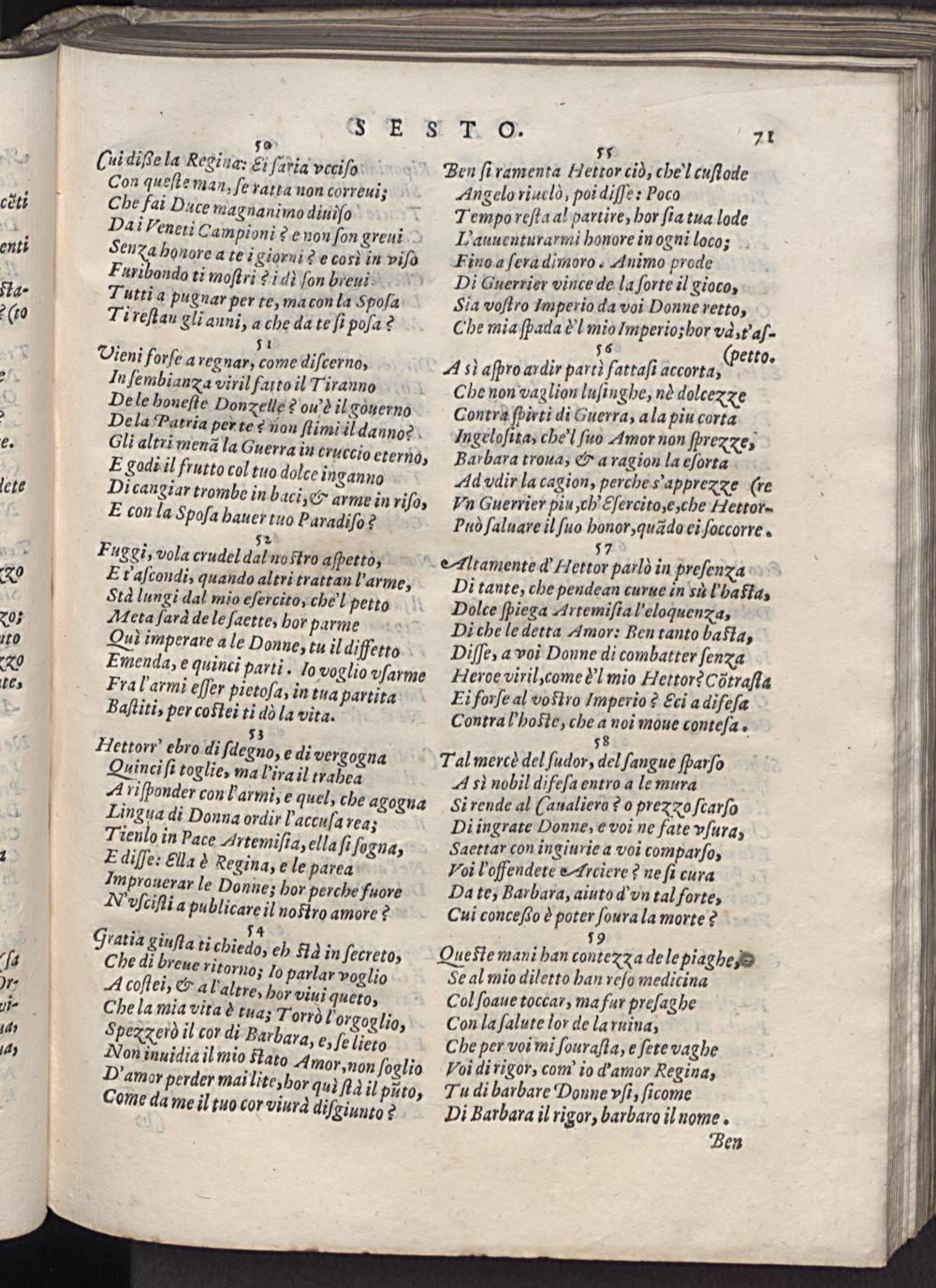 Asl nobil difeſa entro a le mura Si rende al(aualiera? o preæo ſcarſo Di ingrate Donne, e voi ne fate vſura, Saettar con ingiurie a voi comparſo, Voi l'offendete e Trciere? ne ſi cura Da te, Barbara, aiuto d'vn tal forte, Cui conceſioò poter ſoura la morte?
