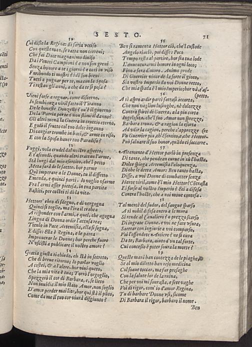 75 Ben ſi ramenta Hettor cid, che'l cuſtode Angelo riuclò, poi diſſe: Poco Tempo reſtaal partire, hor ſia tua lode Lauuenturarmi honore in ogni loco; Fino a ſera dimoro. Auimo prode Di Guerrior vince de la. ſorte il gioco, Sia voſtro Imperio da voi Donne retto, Che mia ſpada èl mio Imperio: hor vd,t'aſ⸗ . 25(petto. ASl aſpro ardir partl fattaſi accorta, Che non vaglion luſinghe, nè dolceæe Contra ſpirti di Guerra, ala piu corta In enhſe chel ſuo Amor non ſbrexxe, Barbara troua,& a ragion la eſorta Ad vdir la cagion, perche s'appreæe(e Vn Guerrier piu, ch'&ſercito, e,che Hettor- Pnudò ſaluare il ſuo honor, quãdo ei foccorre.