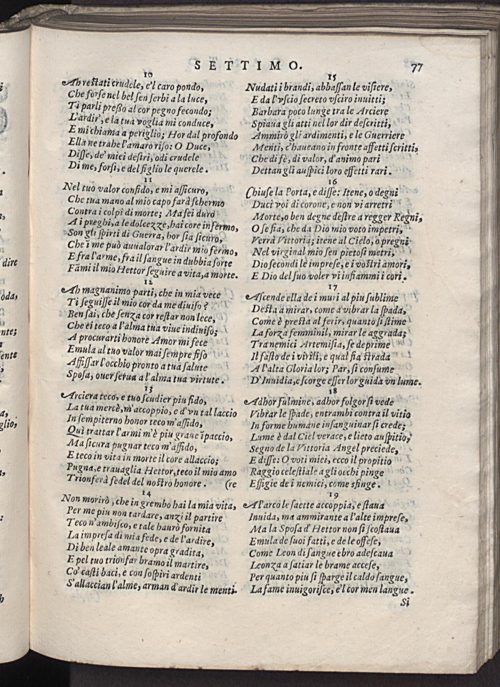 . 11 Nel tuo valor confido, e mi aſſicuro, Che tua mano al mio capo fard ſthermo Contra i colpi di morte; Ma ſei durd A i preg bi, a le doleea ze, hai core infermo, Son gli Pirti di Guerra, hor ſia ſicuro, Che me pudò auualorarl'ardir mio fermo E fralatme, fra il ſan gue in dubbia ſorte 3 Fãmi il mio Hettor ſeguire a vita, a moyte. . 1²2 Ah magnanimo parti, che in mia vete Ti ſeguiſſe il mio cor da me diuiſo?ꝰ?ꝰ Ben ſai, che ſenxa cor reſtar non lece, Che ei tecoa lalma tua viue indiniſo; A procurarti honore Amor mi fece 2 Emula al tuo valor mai ſempre ffo AMſſar Cocchio pronto a tua ſalute Spoſa, ouer ſerua al alma tua virtute. . 13 Arciera teco, e tuo ſcudier piu fido, Ea tua mercò, i' accoppio, e d' vn tal laccio In ſempiterno honor teco m'aſſido, Qul trattar harmi m'd piu graue ꝛpaccio, Ma ſicura pugnar teco m'aſſido, E teco in vita in morte il core allacco; Pugna,e trauaglia Hettor, teco il mio amo Trionfera fedel del noftro honore.(re