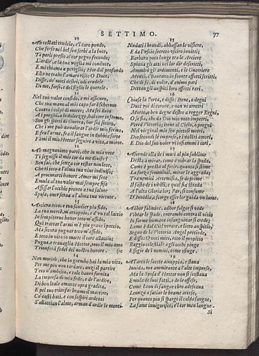 1 Non morird che in Eemb hai la mia vita, Per me pin noa tardare, anxi il partire Teco n ambiſco, e tale paurò fornita La imprtſa di mia fede, e de Pardire Di ben leale amante opra gradita. E yel tuo trionfar bramo il martire Co' caſti baci, e con ſoſpiri ardenti ¹ Sallaccian lalme, arman d ardir le menti.