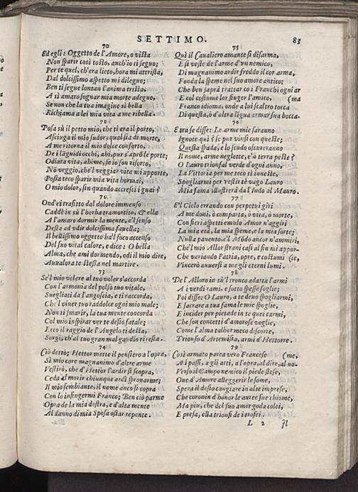 O tra ſe diſſe: Le arme mie ſarauno Ignote qud ſe pur vinſi con quefte; Queſta ſbada, e lo ſcudo oſcureranno Il nome, arme neglette, eu terra pefle? O Lauro trionfal verde d'ogni anno, La Vittoria per me teco sl innefte, Spogliarmi per veſtir tè vago Lauro Aia fama illuſtrerd dal ludo al Mauro.