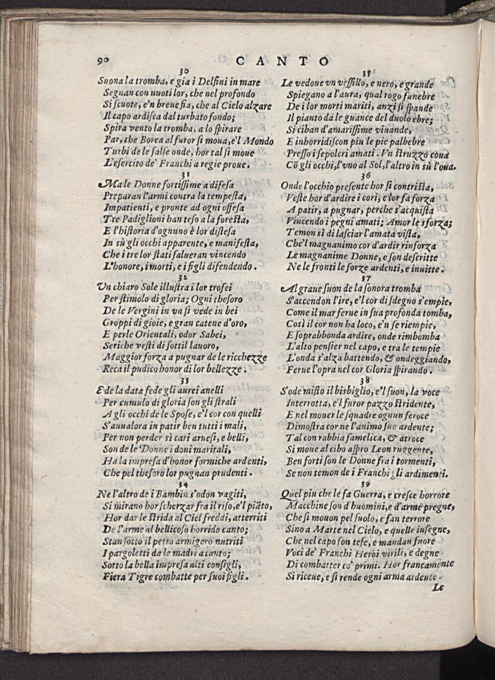 Che nel capo ſon teſe, e mandan fuore Voci de Franchi Heroi vurili, e degne Di combatter co' primi. Hor francamente Si riceue, e ſi rende ogni arma ardente-