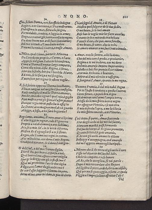 37 Da noua Francia, ò dal mio nobil Regno Per te I'hoſte è condotta a queſta Guerra; Gente feroce, e popolo ben degno Di dominar con l armi ampia terra;, Molla da lo mio ſpirto io teco vegno Per eſpugnar Venetia, e ſe non erra Il mio deſio dal'opra, a me la Gloria Lo mio ſpirto concede, a te Vittoria.