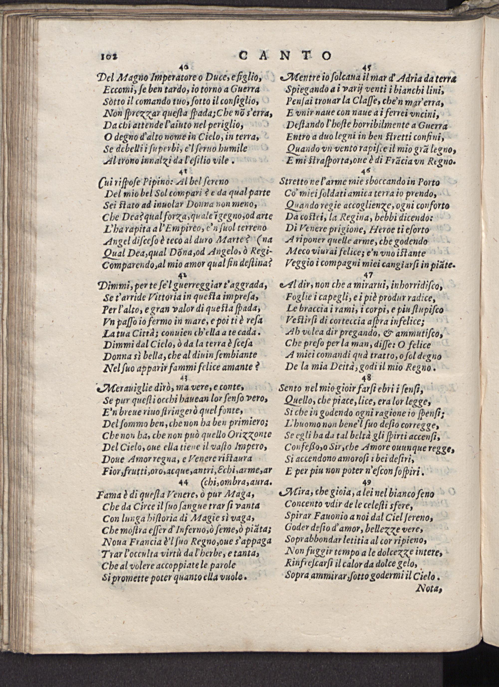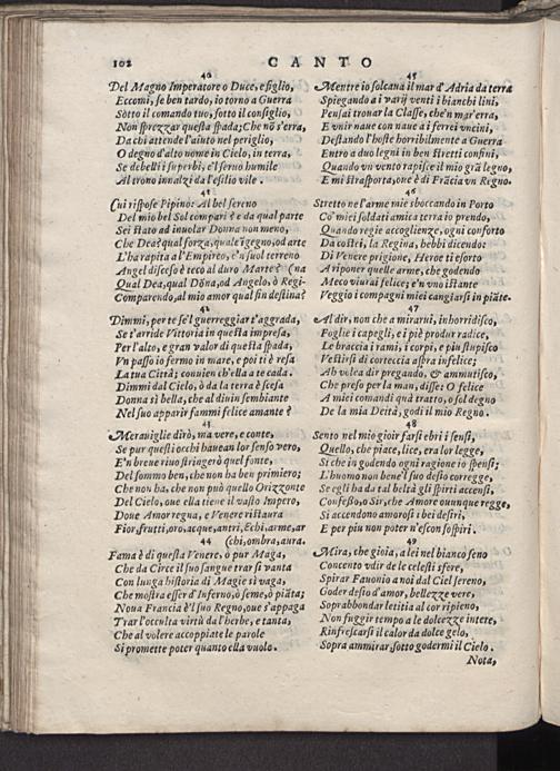 41 (ui riſpoſe Pipino: Al bel ſereno Del mio bel Sol compari? e da qual parte Sei ftato ad inuolar Donna non meno, Che Deas qual fora, quale ĩgegno, od arte Uha rapita al Em pireo, e'n ſuol terreno Angel diſceſoè teco al duro Marte?(na Qual Dea, qual Dõna, od Angelo, ò Regi- Comparendo, al mio amor qual ſin deſtina? 4 2