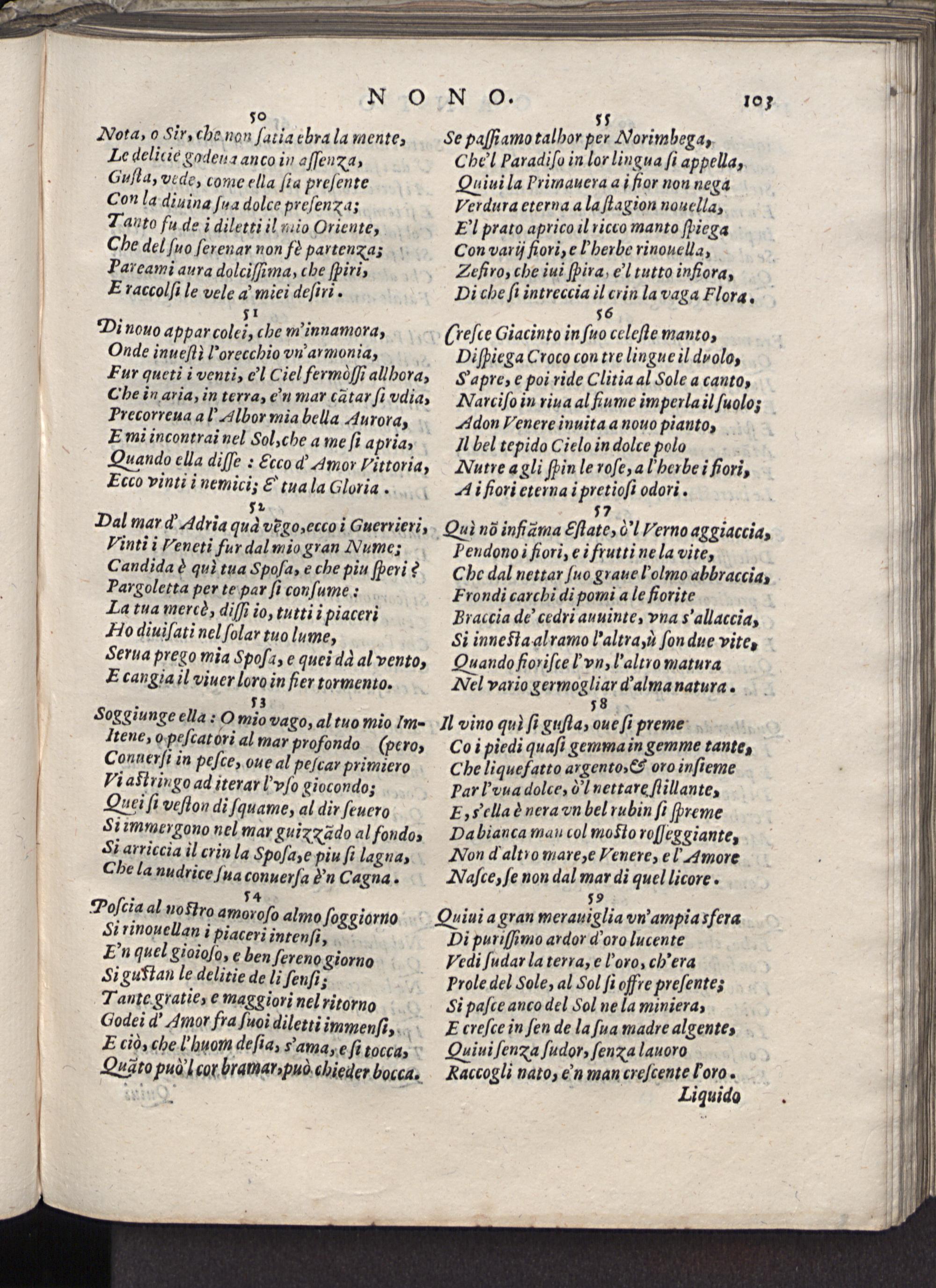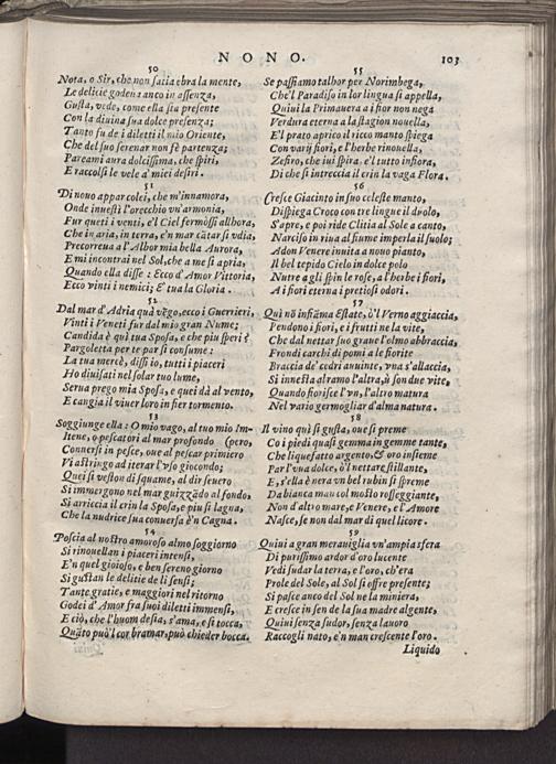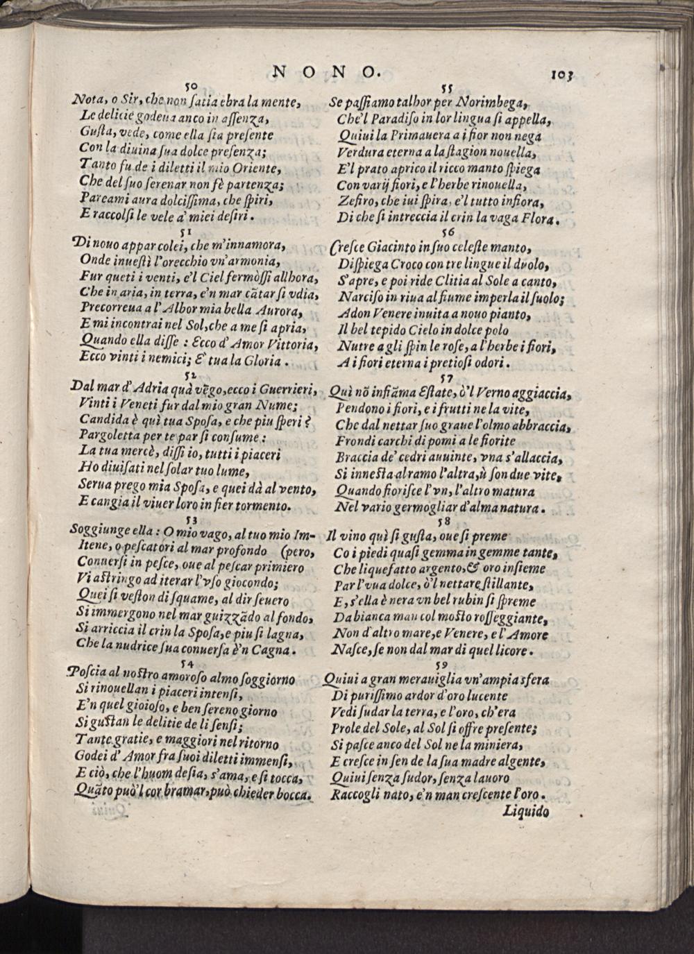 N O. 55 Se paſſiamo talbor per Norimbega, Cheꝰ Paradiſo in lor lingua ſi appella, Quiui la Primauera a i fior non nega Verdura eterna a laſtagion nouella, E'l prato aprico il ricco manto ſpiega Con varij fiori, e herbe rinouella, Zeſiro, che iui ſpira, e'l tutto infiora, Di che ſi intreccia il erin la vaga Flora. 56 (reſce Giacinto in ſuo celeſte manto, Diſpiega Croco con tre lingue il duolo, S'apre, e poi ride Clitia al Sole a canto, Narciſo in riua al fiume imperla il ſuolo; Adon Venere inuita a nouo pianto, Il bel tepido Cielo in dolce polo Nutie a gli ſpin le roſe al herbe i fiori, Ai fiori eterna i pretioſi odori.