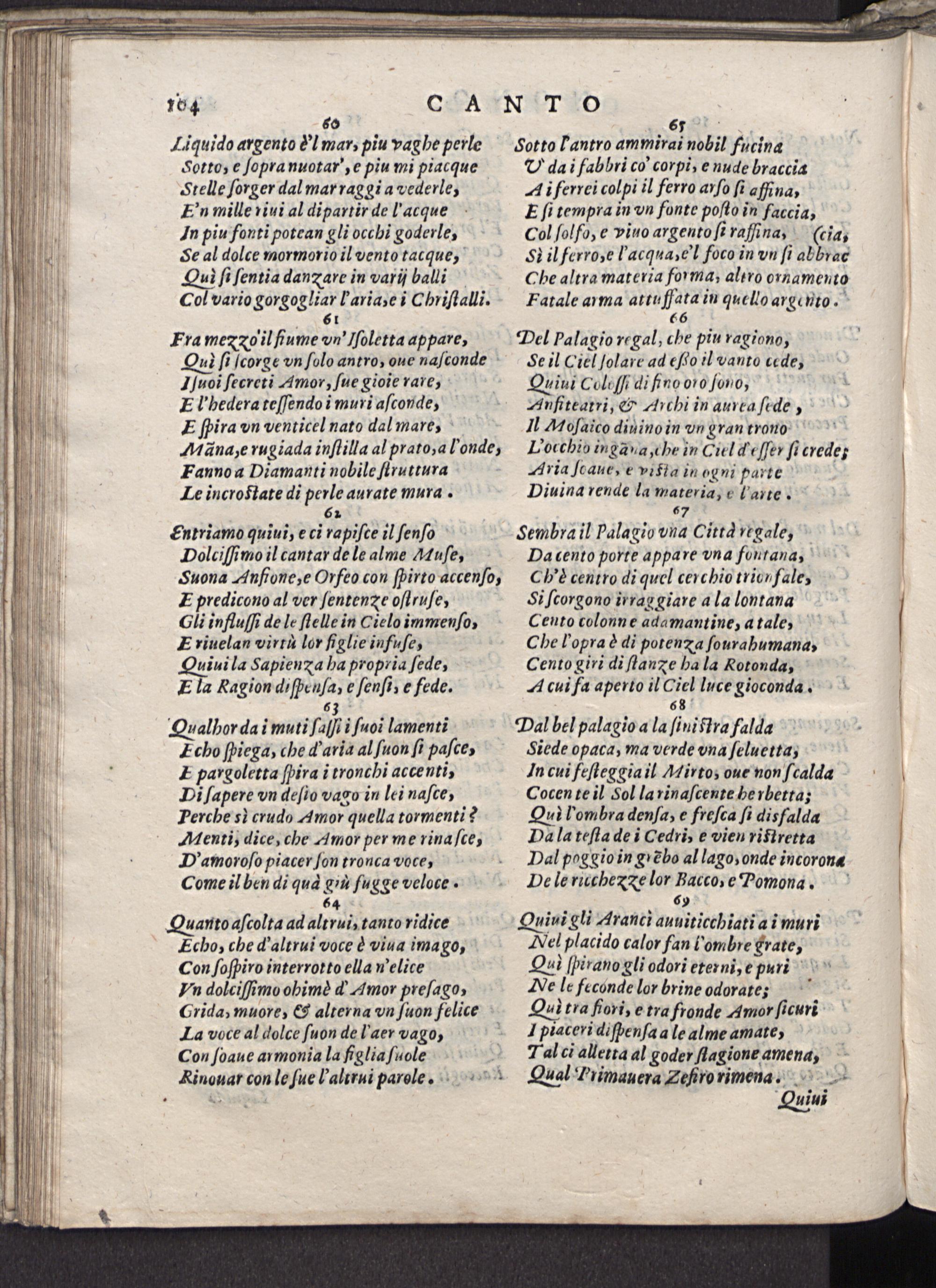 6 Dal bel palagio a la ſini ſtra falda Siede opaca, ma verde vna ſeluetta, In cui feſteggia il Mirto, oue non ſcalda Cocen te il Sol la rinaſcente herbetta; Qui T'om bra denſa, e freſca ſi disfalda Da la teſta de i Cedri, e vien riftretta Dal pogęio in grbo al lago, onde incorona De le ricchexXe lor Bacco, e Pomona. 69 Quiui gli Aranci auuiticchiati a i muri Nel placido calor fan'ombre grate, Qui ſpirano gli odori eterni, e puti Ne le feconde lor brine odorate Qul tra hiori, e tra fronde Amor ſicuri I piaceri diſpenſa a le alme amate, Tal ci alletta al goder ſlagione amena, Qual Primauera Zeſiro rimena.