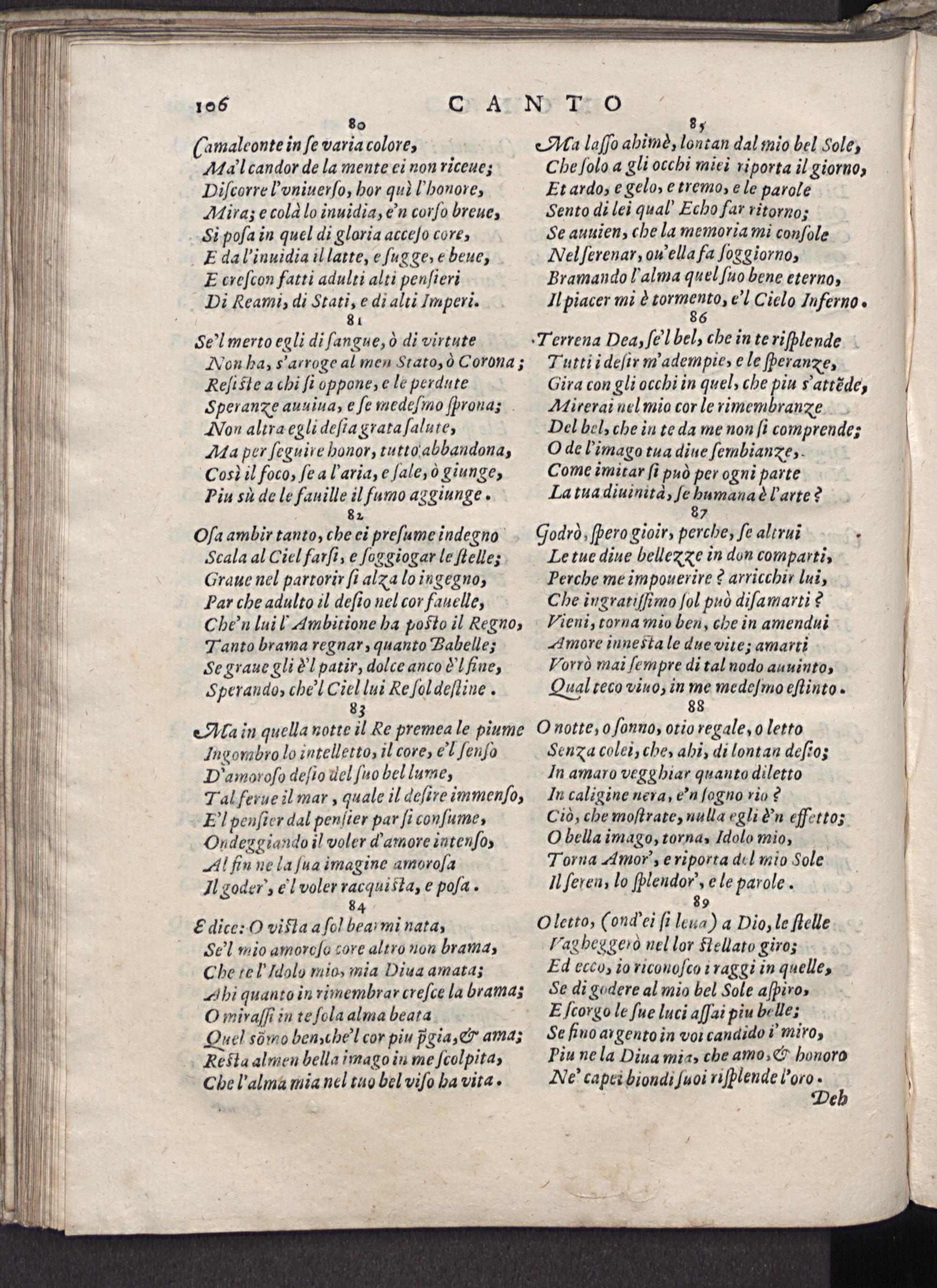 (amaleonte in ſe varia colore, Ma'l candor de la mente ei non riceue; Diſcorrel vniuerſo, hor qul l'honore, Miraz e cola lo inuidia, e'n corſo breue, Si poſa in quel di glaria acceſo core,
