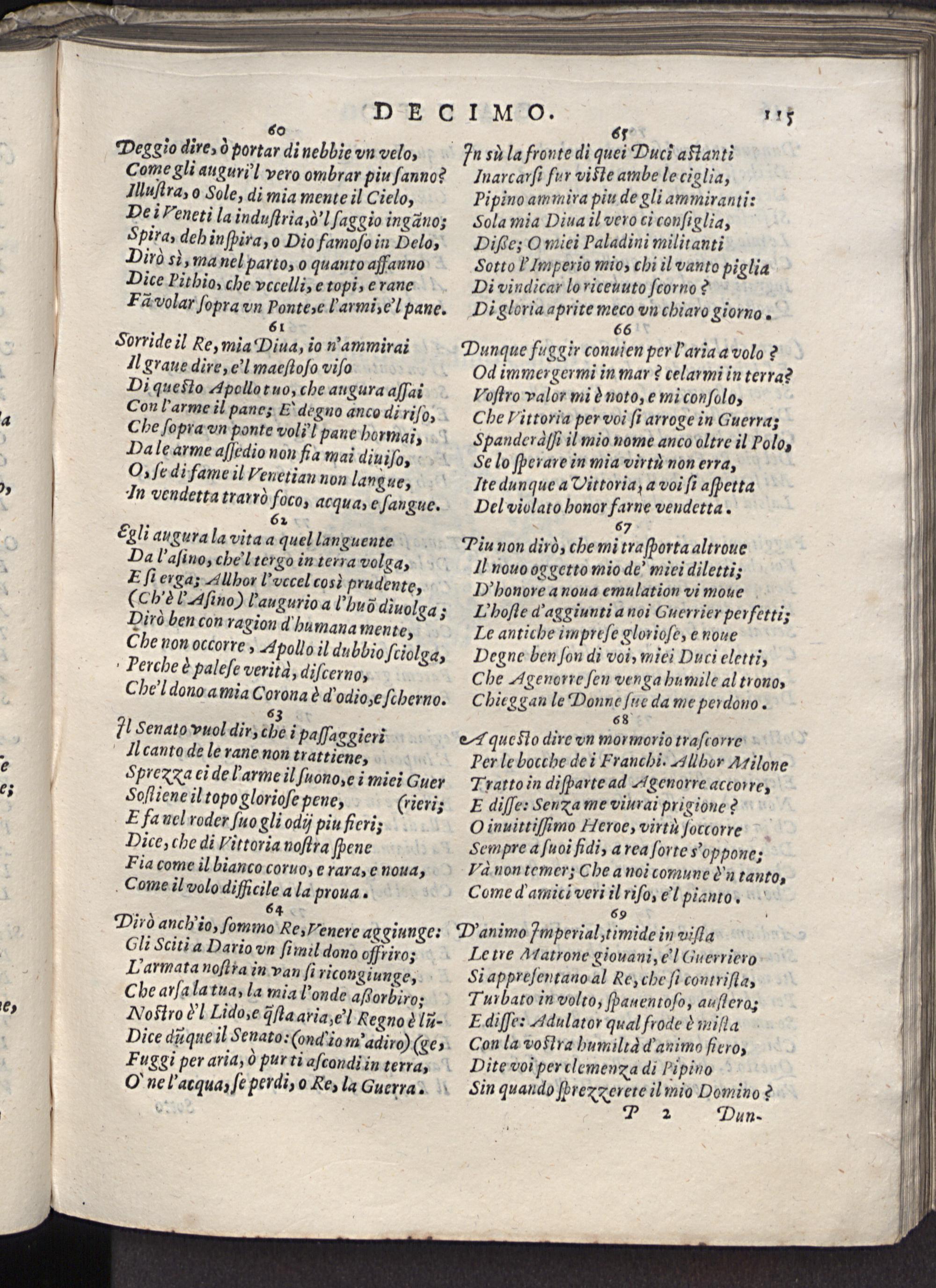 Con l'arme il panes E degno anco di riſo, Che Vittoria per voi ſi arroge in Guerra; Che ſopra vn ponte volil pane hormai, Spanderdſi il mio nome anco oltre il Polo, Da le arme aſſedio non fiᷣa mai diuiſo, e lo ſperare in mia virtu non erra, O, ſe di fame il Venetian non langue, Ite dunque a Dittoriaa a voi ſi aſpetta In vendetta trarrò foco, acqua, e ſaugue. Del violato honor farne vendetta. 62— 67 1 &gli augura la vita a quel languente Pia non dirò, che mi traſporta altroue Dal'aſino, chel tergo in terra volga, Il nouo oggetto mio de' miei diletti, E ſi ergas Allhor l'vccel cos⸗ prudente, D'ponore a noua emulation vi moue ( 06 Aſino) P'augurio a l'huõ diuolga Lbhoſle d'aggiunti a noi Guerrier perfetti; Dirdò ben con ragion d pumana mente, Le antiche impreſe glorioſe, e noue Che non occorre, Apollo il dubbio ſciolga, Degne ben ſon di voi, miei Duci eletti, Perche è paleſe veritd, diſcerno, Che Agenorre ſen venga humile al trono, Chel dono amia Corona e d'odio, e ſcherno. Chieggan le Donne ſue da me perdono. 68