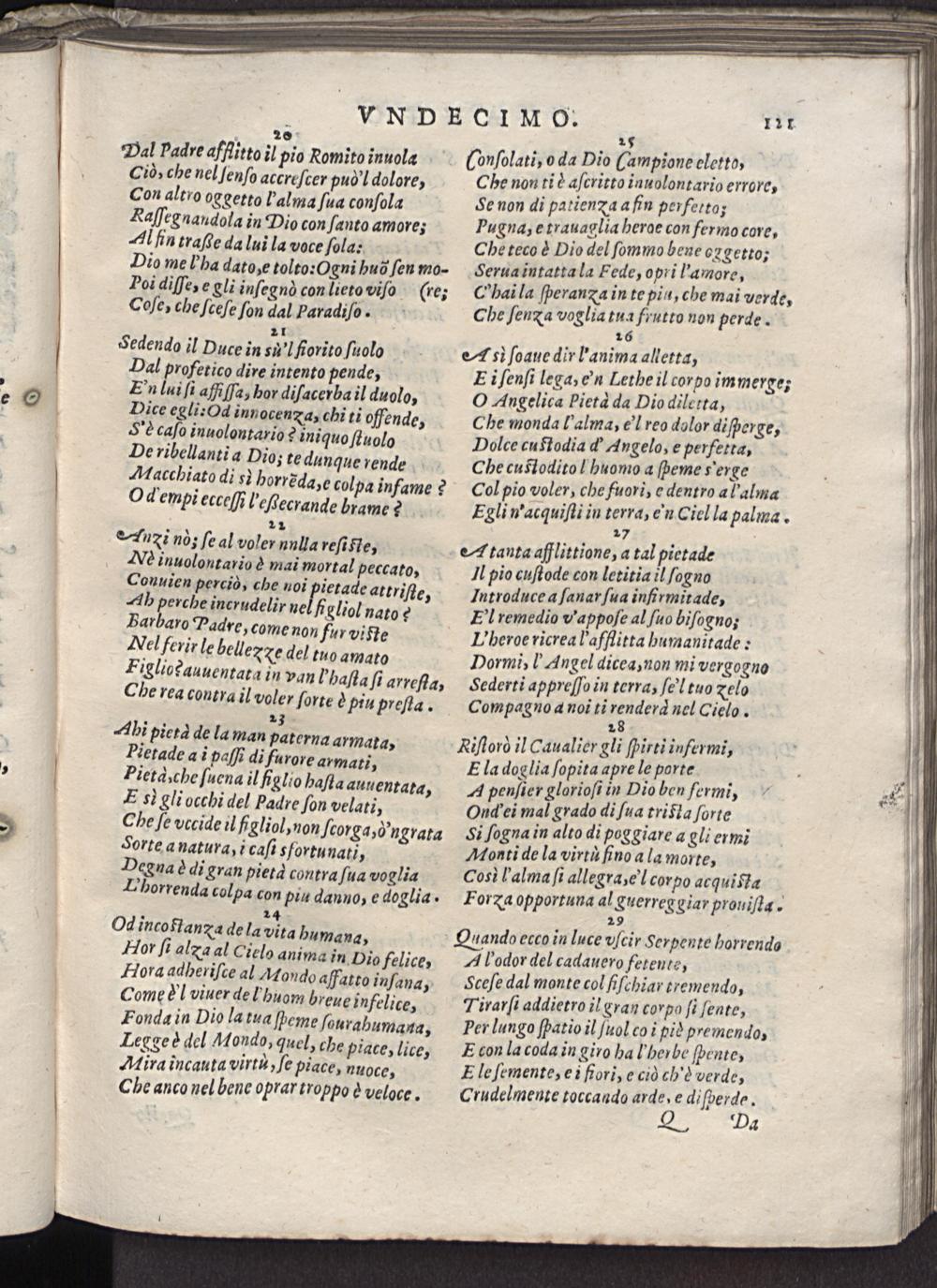Sedendo il Duce in su'l fiorito ſuolo Dal profetico dire intento pende, E'n lui ſi afiſſa, hor diſacerba il duolo, Dice egli: Od innocena, chi ti offende, S' caſo inuolontario? iniquo ſtuolo De ribellanti a Dio, te dunque rende Macchiato di s horrẽda,e colpa infame? Od empi ecceſñ l'eſtecrande brame?