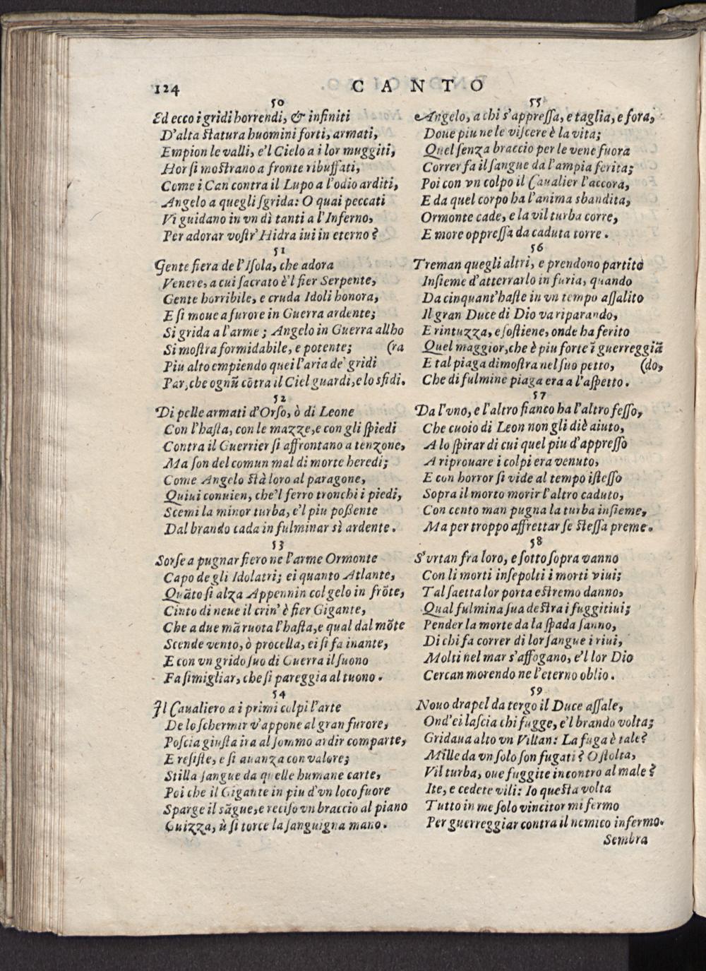 7!(nualiero a i primi colpi harte De lo ſchermir Vappone al gran furore, Poſcia ginſta ira al ſommo aidir comparte, E reſifte, e ſi auaua con valores Stilla ſangue da q elle bumane carte, Poĩ che il(igante in piu d' vn loco fuore Sparge il sague,e reciſo vn braccio al piano Cuixa, u ſi torce la ſanguigna mano-
