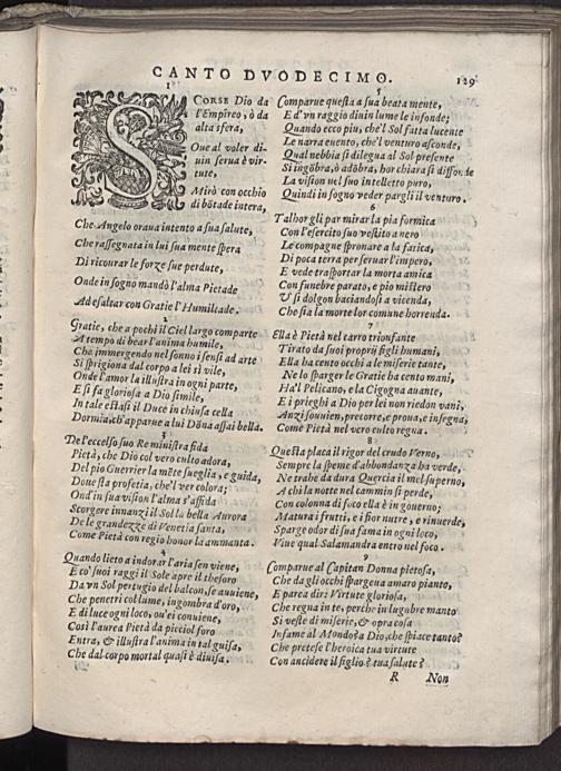 aſi il Duce in chiuſa cella h'apparue a lui Dona aNai bella. Come Pieta nel vero culto regua. Ne l'eccelſo ſuo Re muiſra fida Pietd, che Dio col vero culto adora, Del pio Guerrier la mẽte fueglia, e Luida, Doue ſla profetia, chel ver colora; QOnd in ſua viſion l'alma y'aſſida