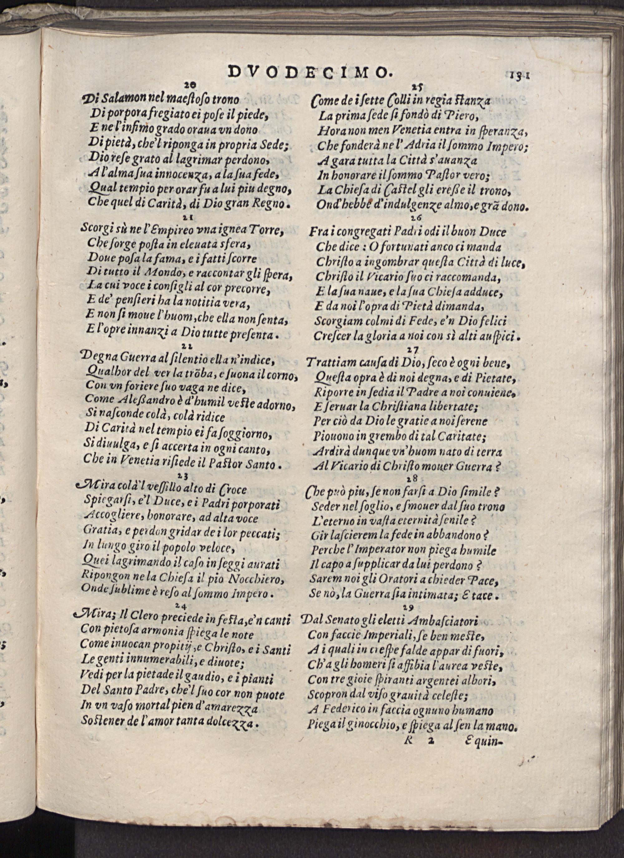 1 Degna Guerra al ſilentio ella n'indice, Qualhor del ver la trãba, e ſuona il corno, Con vn foriere ſuo vaga ne dice, Come Aleſßsandroò d'bumil vefte adorno, Si naſconde cola, cold ridice Di Carità nel tempio ei fa ſoggiorno, Si diuulga, e ſi accerta in ogni canto, Che in lenetia riſiede il paftor Santo.