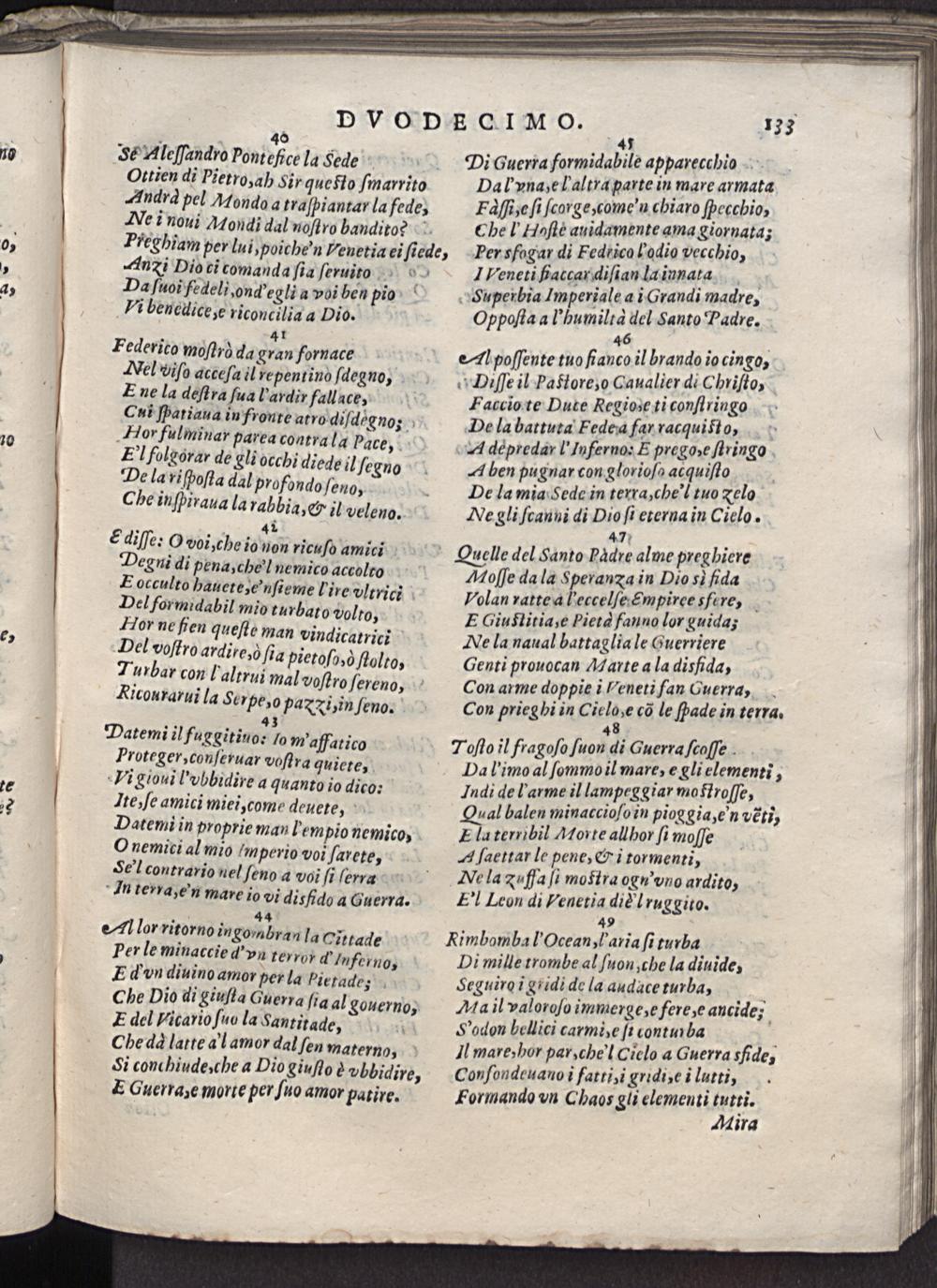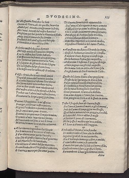 47 7 Quelle del Santo Padre alme preghiere Moſſe da la Sperana in Dio si fida Volan ratte a l'eccelſe ẽmpireesfere, E Giuftitia, e Pietd fauno lor guida; Ne la naual battaglia le Guerriere Genti prouocan Marte a la disfida, Con arme doppie i Veneti fan Guerra, Con prieghi in Ciele cõ le ſpade in terra.