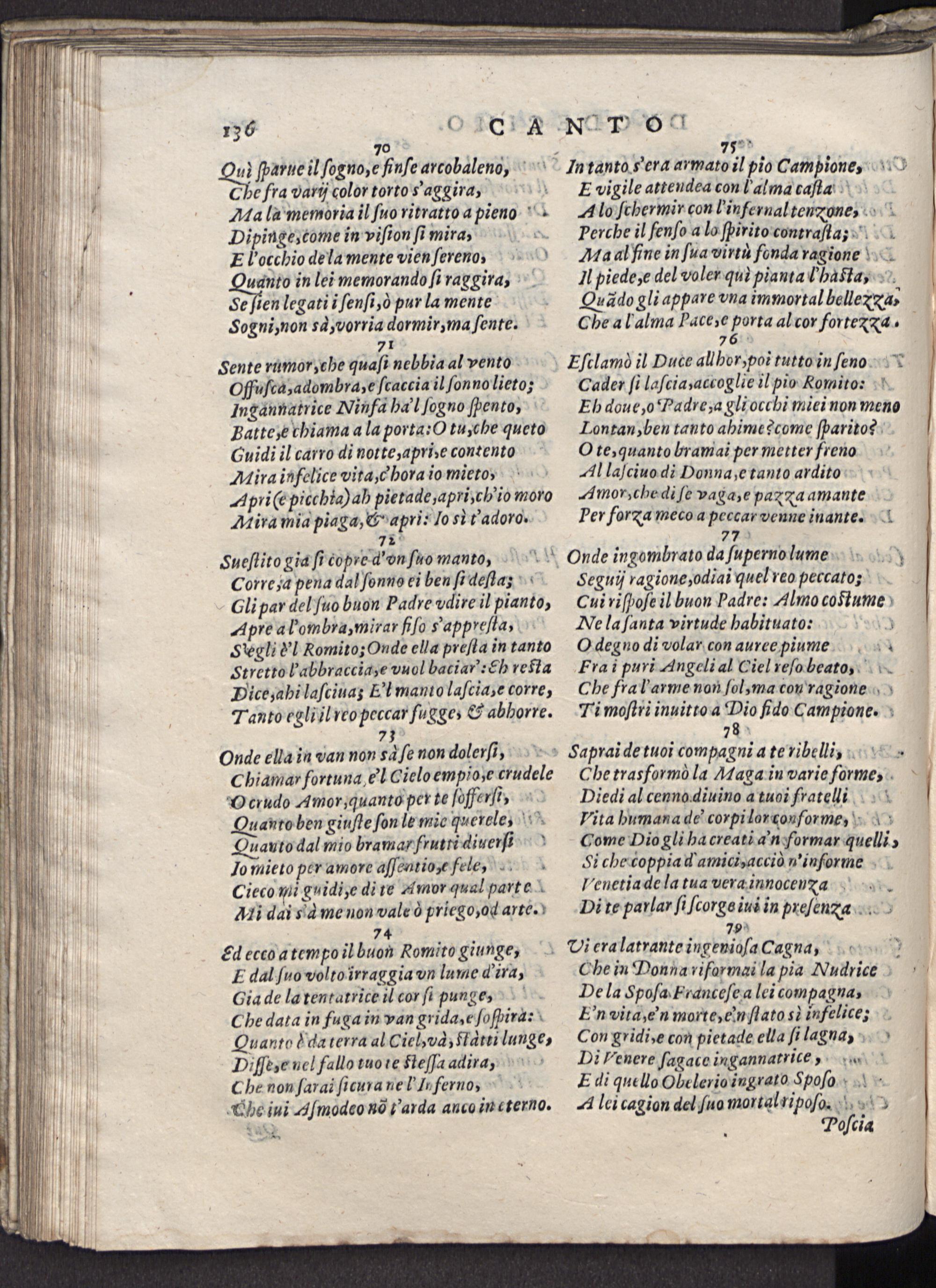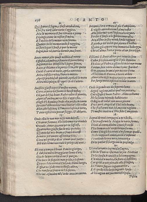 71 Sente rumor, che quaſi nebbia al vento Offuſca, adombra, e ſcaccia il ſonno lieto; Ingannatrice Ninfa hal ſogno ſpento, Batte‚e chiama a la porta: Otu,che queto Guidi il carro di notte, apri,e contento AMira infelice vita, c hora io mieto, Apri( picchia) ah pietade, apri‚ ch io moro Mira mia piaga,& apri: Io si t adoro. 7² Sueſtito gia ſi copre d'vn ſuo mantoo Corre a pena dal ſonno ei ben ſi deſta; Cli par del ſuo buon Padre vdire il pianto, Apre al'ombra, mirar fiſo Sappreſta, Sugli d'l Romito; Onde ella preſta in tanto Stretto Pabbraccia,e vuol baciar'e&h refta Dice, ahi laſciuas E't manto laſcia, e corre, Tanto egliil reo peccar ſugge,& abhorre.